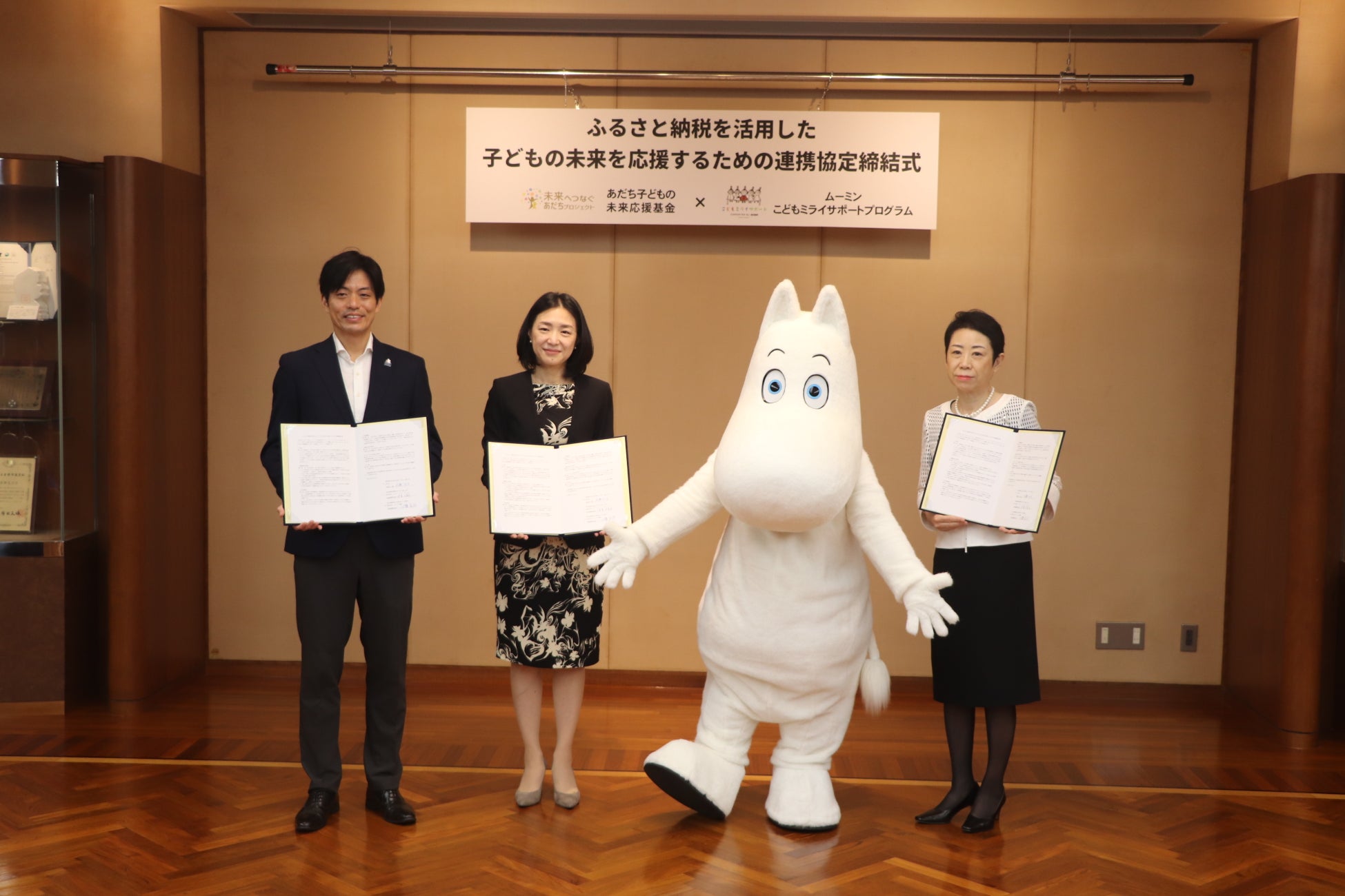生まれ育つ環境に左右されることなく、すべての子どもたちが夢や希望を持ち、健やかに成長できる足立区の実現に向け、未来へつなぐあだちプロジェクト「あだち子どもの未来応援基金」と「ムーミン こどもミライサポートプログラム」が提携し、2024年8月2日に「ふるさと納税を活用した子どもの未来を応援するための連携協定」を締結しました。
