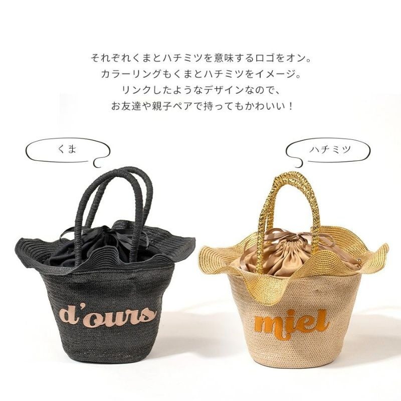 「くまのハチミツ」甘くてかわいい名前にぴったりなデザインのかごバッグです。リンクしたようなデザインなので、お友達や親子ペアで持ってもかわいい!本体約220グラムと超軽量なのも魅力です◎