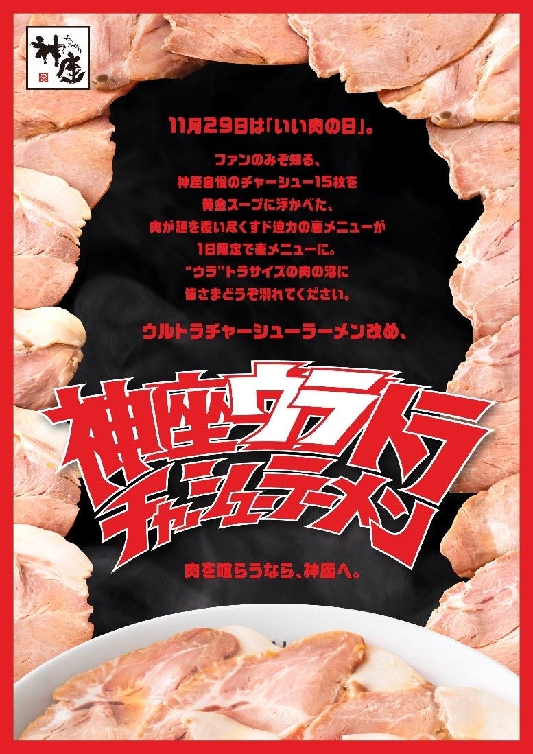 「ウルトラチャーシューラーメン」は、神座のファンのみぞ知る、神座自慢のチャーシュー15枚を黄金のスープに浮かべた裏メニューとして存在している一品です。肉が麺を覆い尽くすインパクトで、満足感もたっぷりのこのメニューを、年に1度の「いい肉の日」に合わせて表メニューにひっくり返すことで、より多くの皆さまにお楽しみいただきたいと企画いたしました。