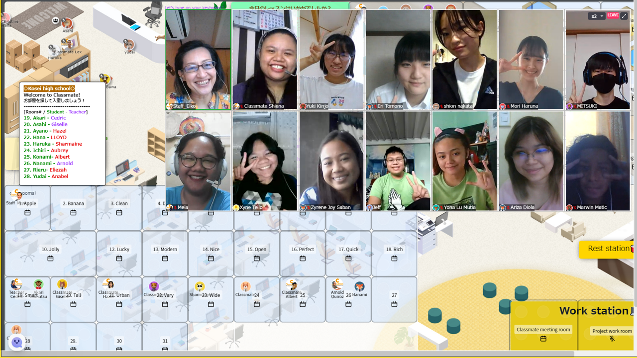 メタバース上の2Dのバーチャル教室で、海外留学しなくても自宅や学校にいながら英会話レッスン、異文化理解、国際留学の3要素を安全・安心・安価で学ぶことができるサービス。