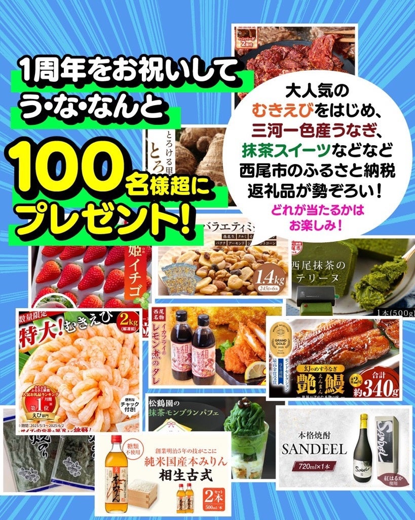 愛知県西尾市(市長:中村健、以下「西尾市」)は、ふるさと納税公式インスタグラムの開設1周年を記念して、日頃の感謝を込めた「大感謝祭プレゼントキャンペーン」を開催しています。西尾市自慢の特産品が当たるチャンス!フォロー&いいねと応募だけで、誰でも気軽にご参加いただけます。