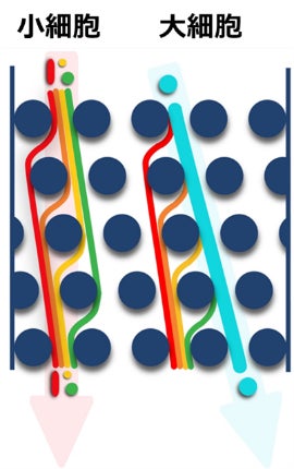 *1: マイクロ流路中のピラー(微小柱)によって生じる流れを利用して、大きさに基づいて細胞を分離する技術