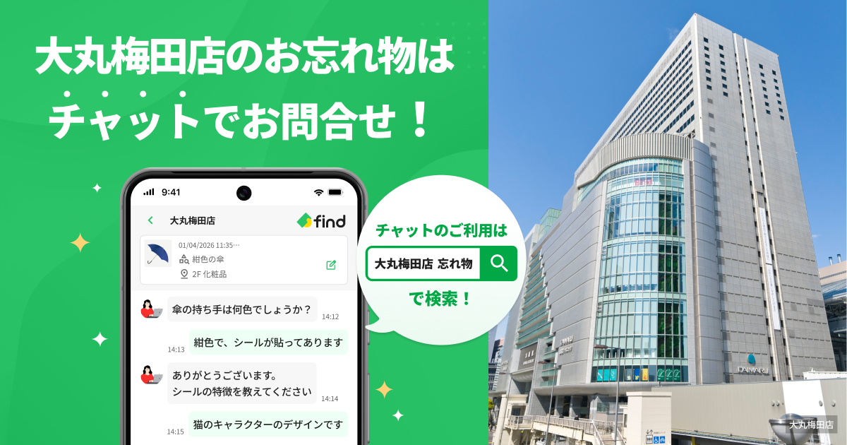 株式会社大丸松坂屋百貨店(本社:東京都江東区、代表取締役社長:宗森 耕二)は、株式会社find(本社:東京都港区、代表取締役CEO:高島 彬)が提供する「落とし物クラウドfind」を、大丸梅田店に導入します。2026年4月1日(水)より、お忘れ物に関するお問い合わせをチャットで受け付けることが可能となります。また、遺失物対応スタッフ向けの業務アプリも導入し、業務効率化とサービス品質の向上を図ります。
