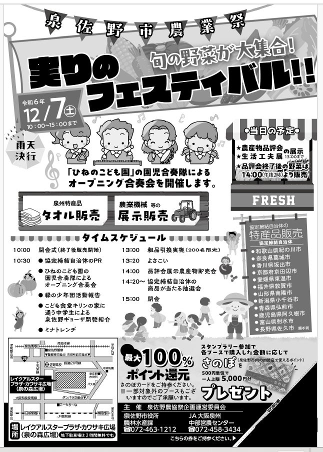 ■日時:2024年12月7日(土)10:00~15:00 ■場所:レイクアルスタープラザ・カワサキ広場(泉の森広場)(〒598-0005大阪府泉佐野市市場東1丁目2-295-1)