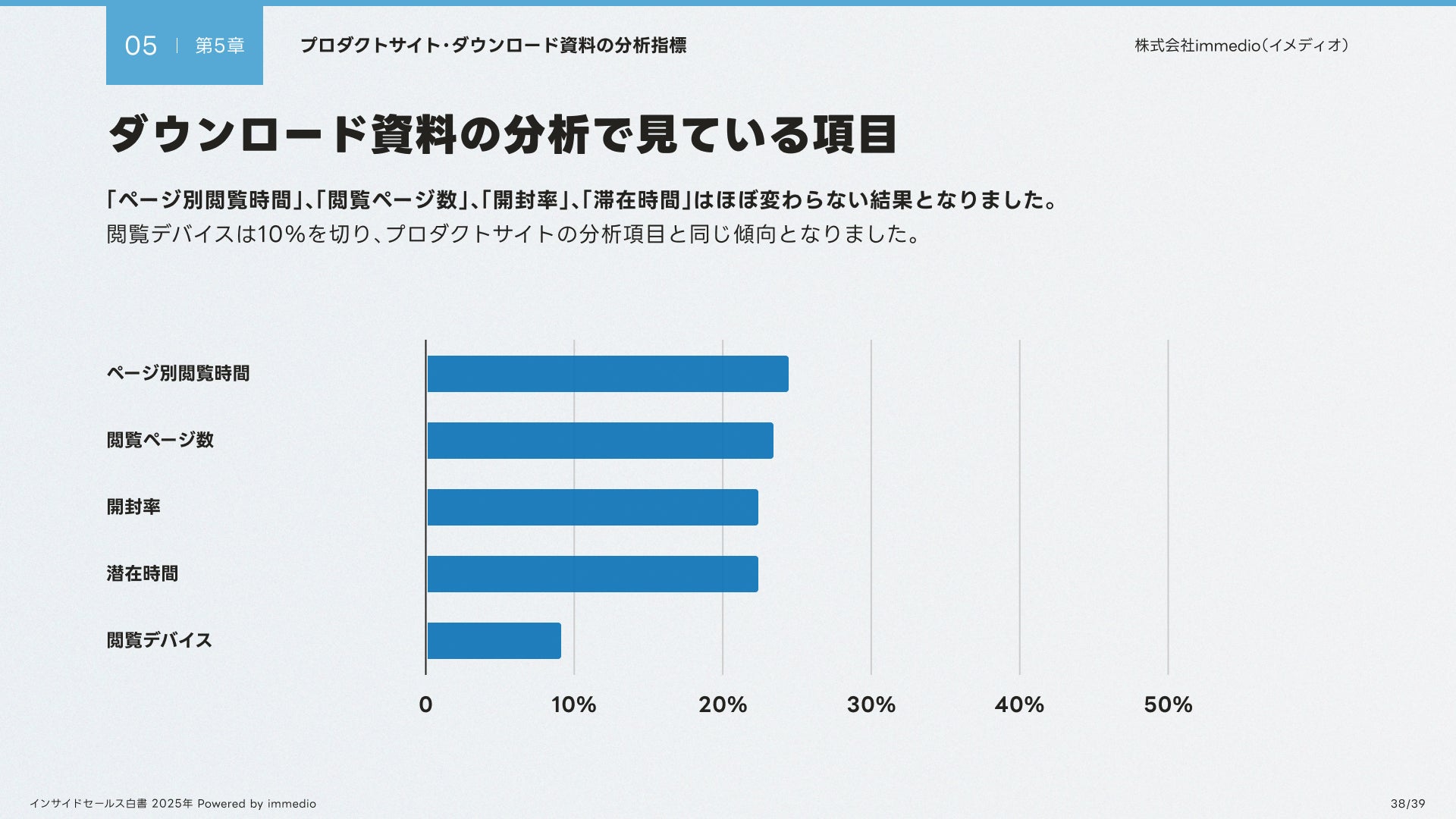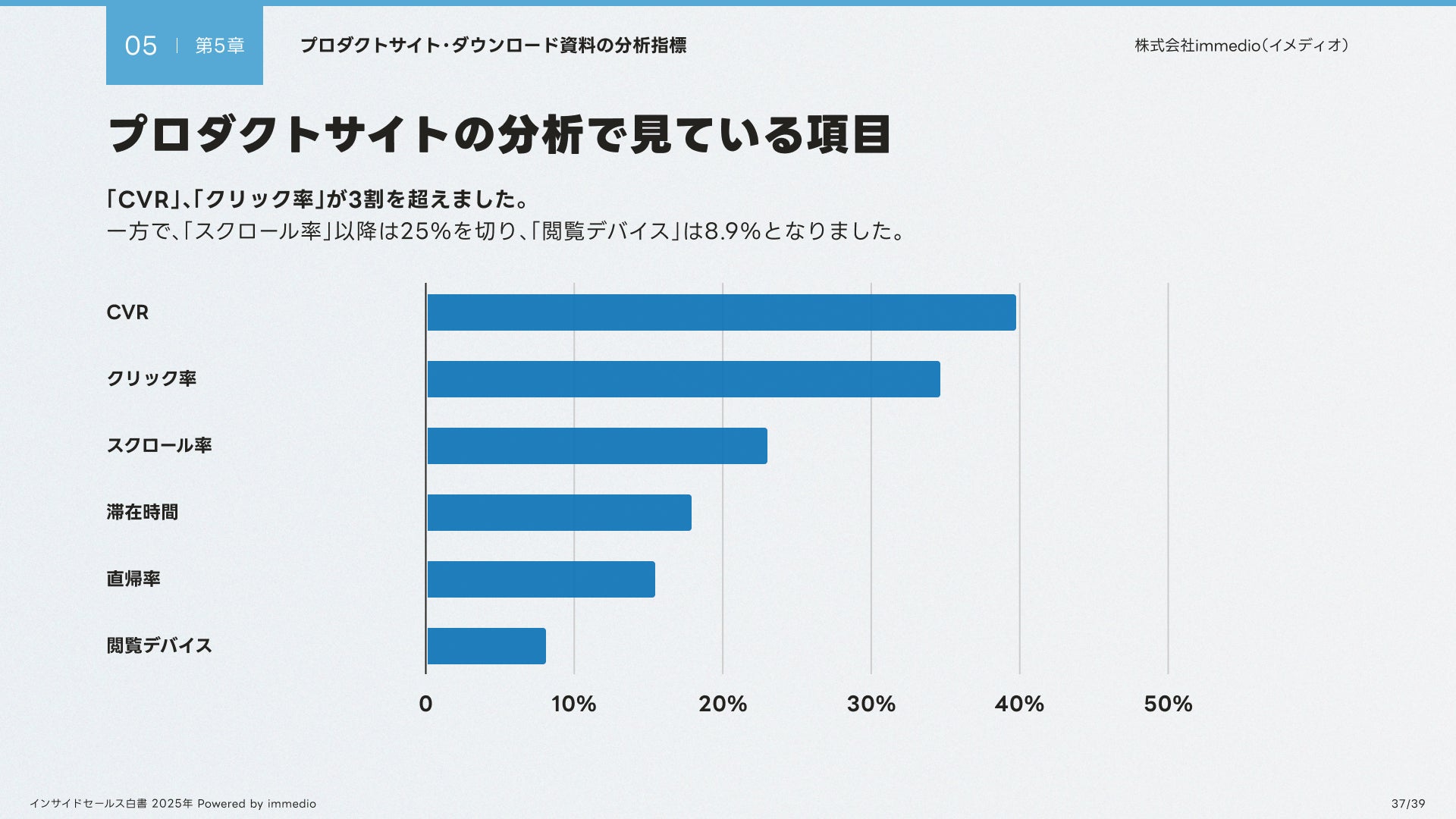 コンテンツの分析ではウェブサイトでは「CVR」、「クリック率」が35%以上の企業で分析されているが、ダウンロード資料ではいずれの指標も25%以下に留まる。