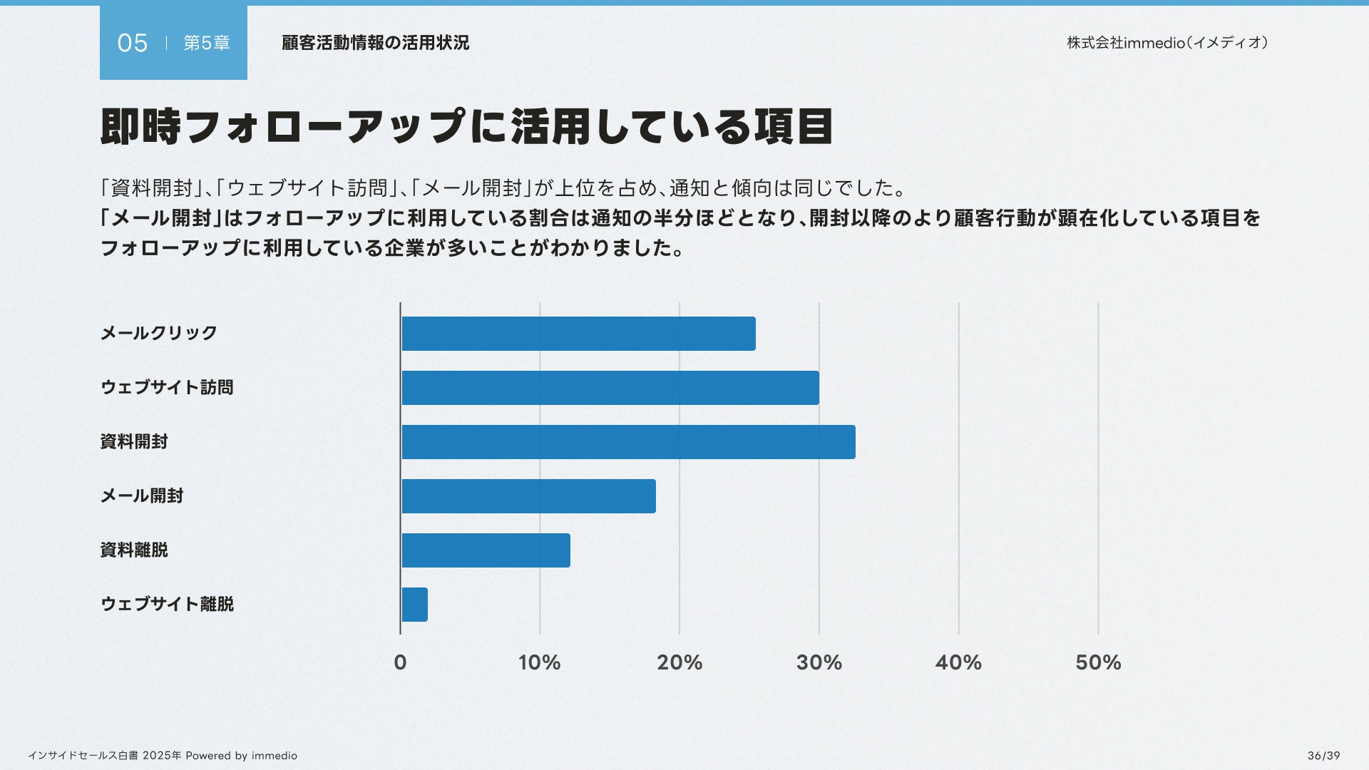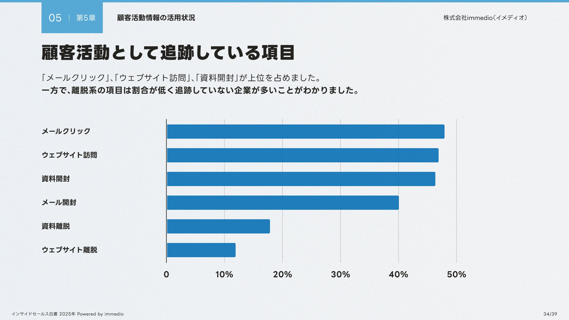 顧客活動で追跡している指標は「メールクリック」「ウェブサイト訪問」「資料開封」が多く、 45%以上。ただし、それらを即時フォローアップに活用できているのは半分程度に留まる。