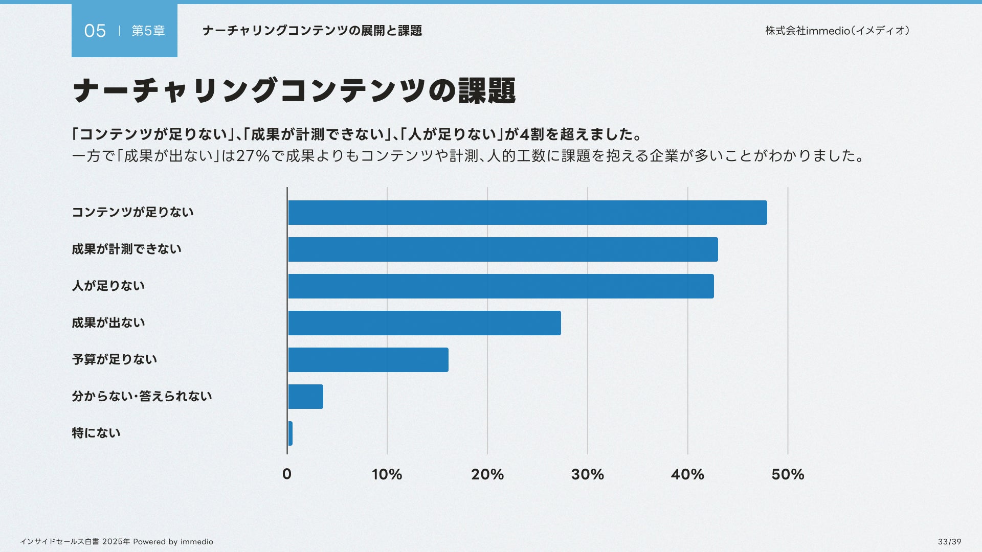 ナーチャリングの課題は「コンテンツ不足」「成果の計測不可」「人手不足」が多く、 40%以上で出現。