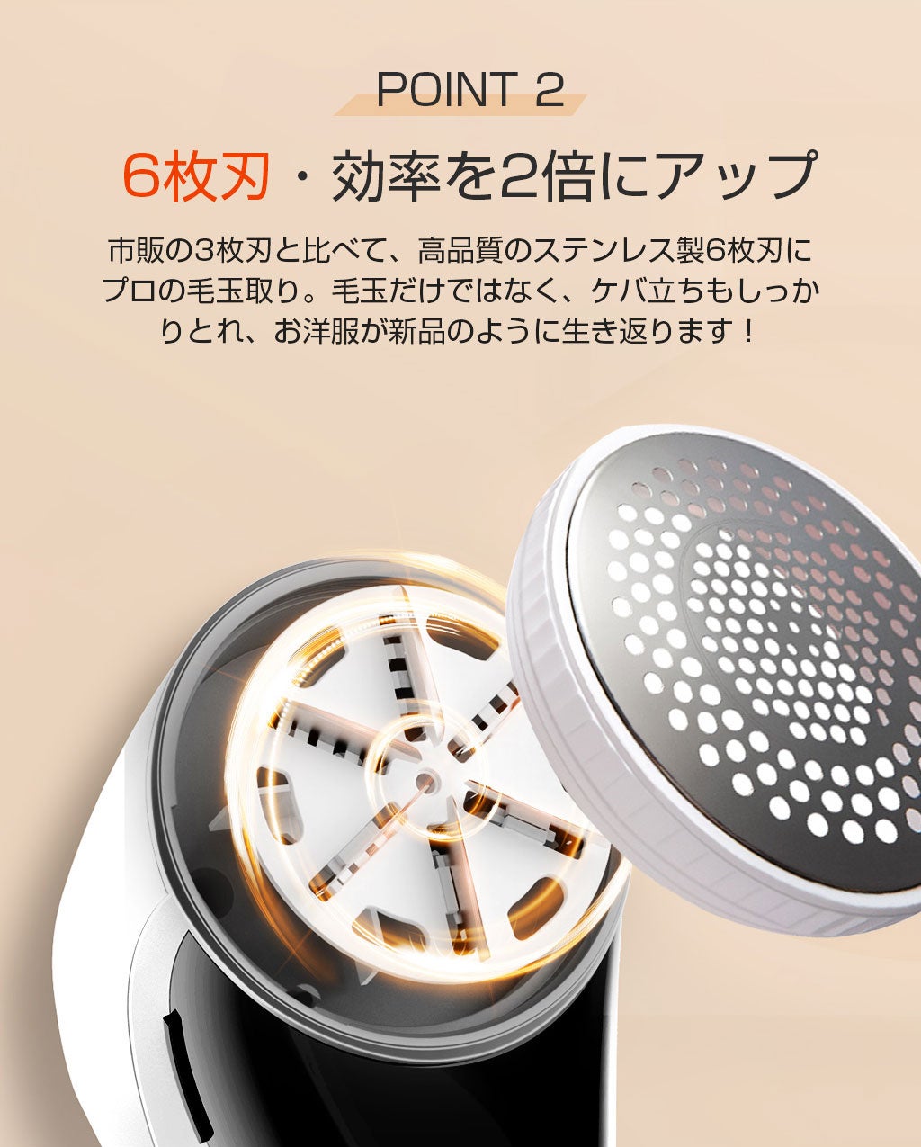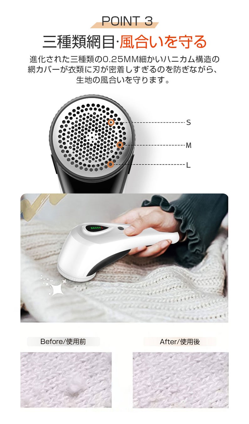 この新型毛玉取り器はおしゃれな外観に良い握り心地に加え、画面を表示する電子ディスプレイと超大容量のダストボックスも付いています。56mmの超大型カッターヘッドで、通常の毛玉取りより取る範囲が広く、様々な毛玉を短時間で手軽に取ることができます。 急いで外出されようとする時でも、2分間だけで服をリフレッシュします。