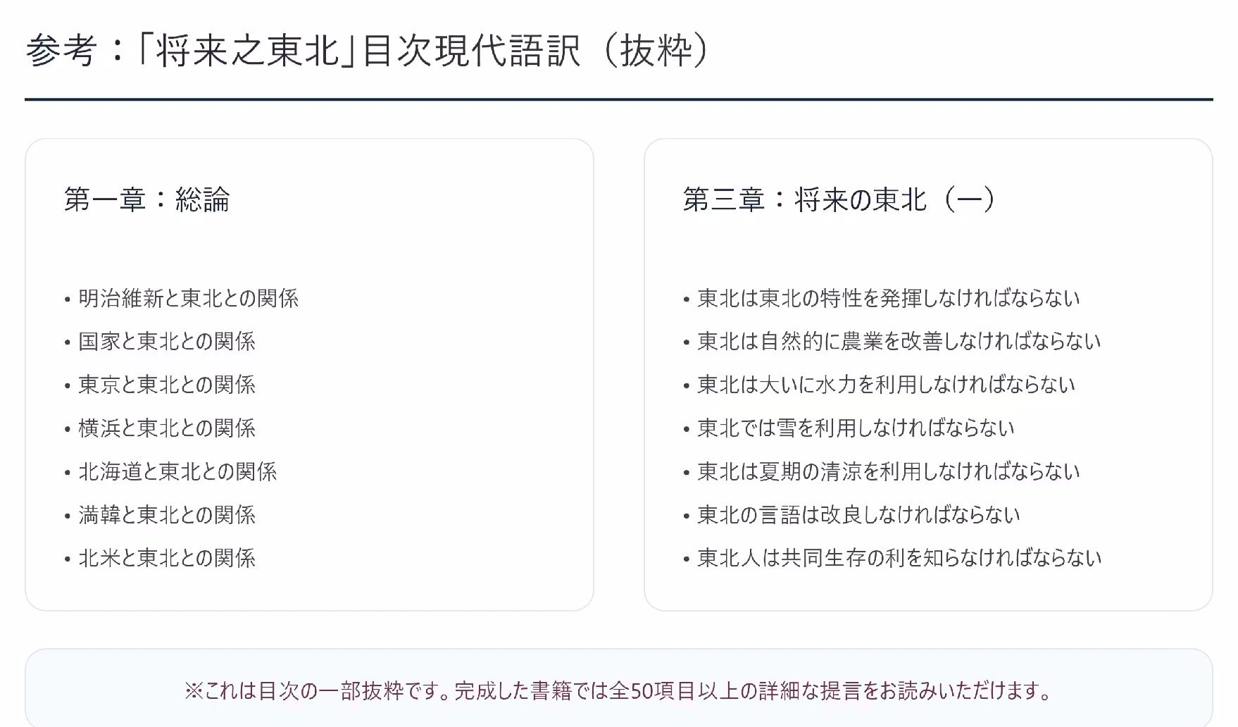 私たちは震災から15年というこのタイミングで明治の知性が描いた未来図を現代に接続し、東北再生のための知的インフラを構築するため本書の復刻を決意しました。