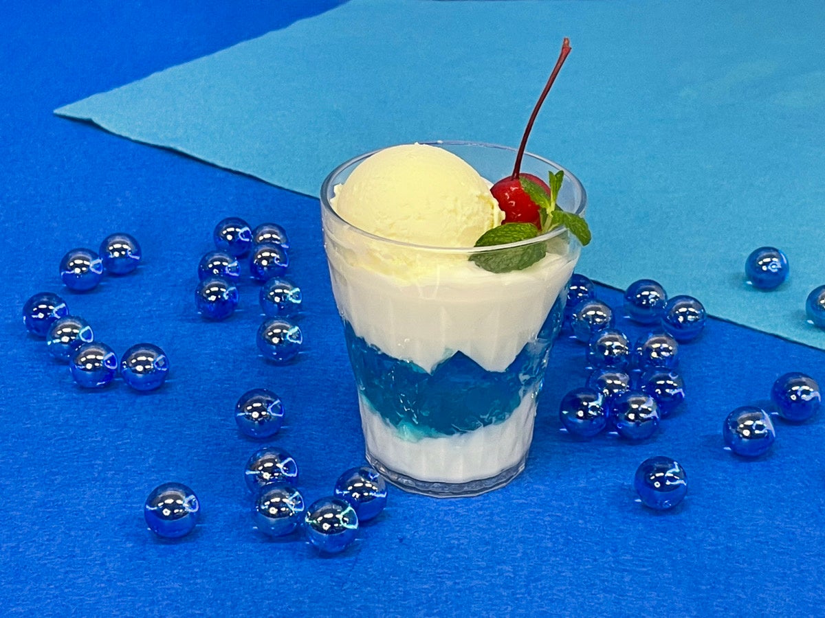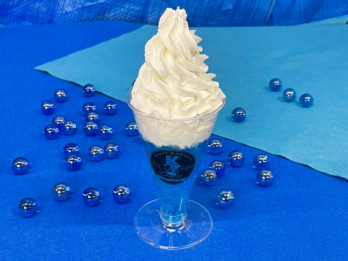 バニラアイス、サイダーゼリー、ミルクプリンが絶妙にマッチした見た目も美しいスイーツで、SNS映えも完璧! 爽やかなサイダーの風味と、なめらかなバニラアイスとミルクプリンの口当たりが広がります。また、青いサイダーゼリーがアクセントとなり、味のバランスが整っていることにも驚くでしょう。