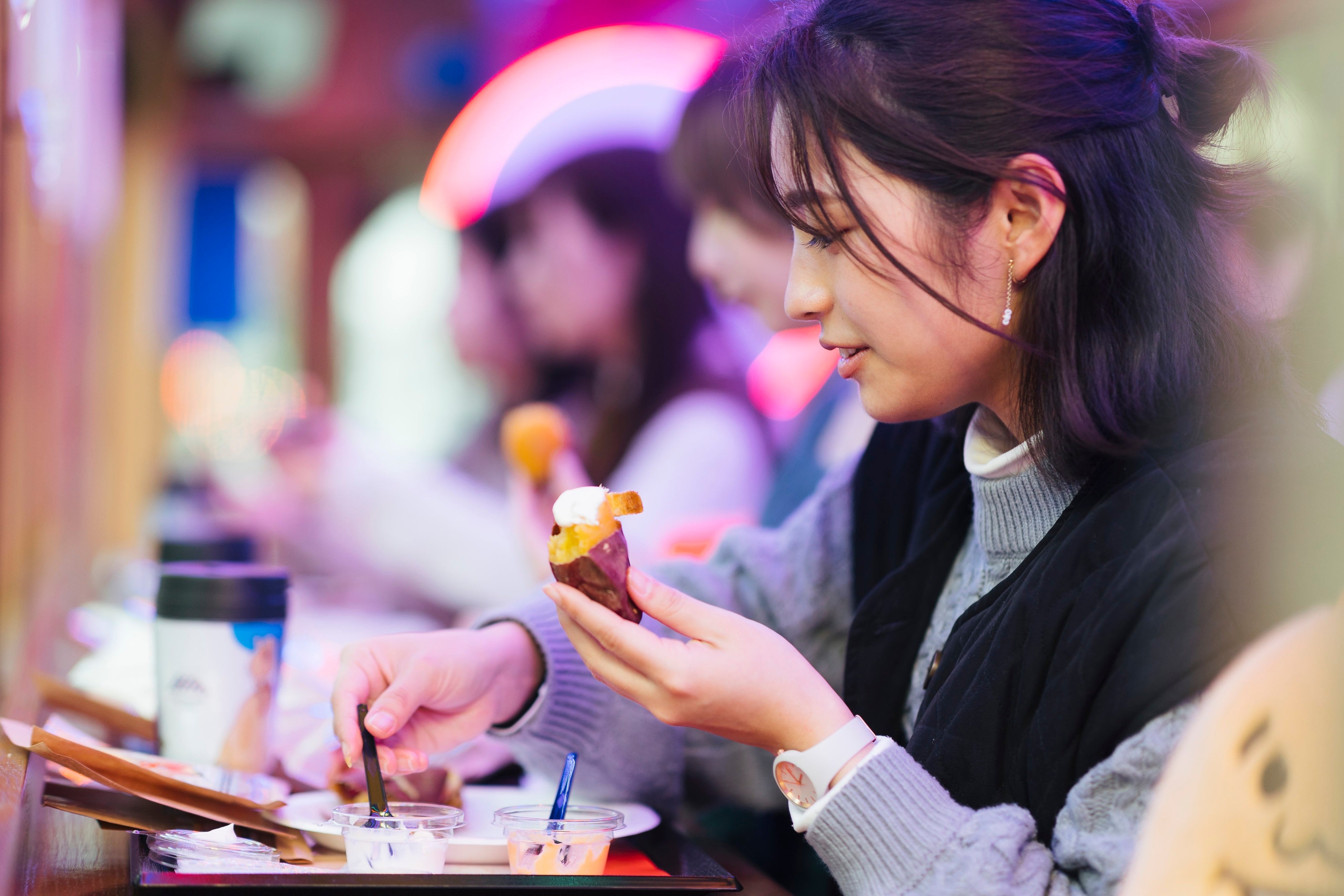 車内も赤と青のLEDで装飾された非日常な空間でやきいもを楽しみます。