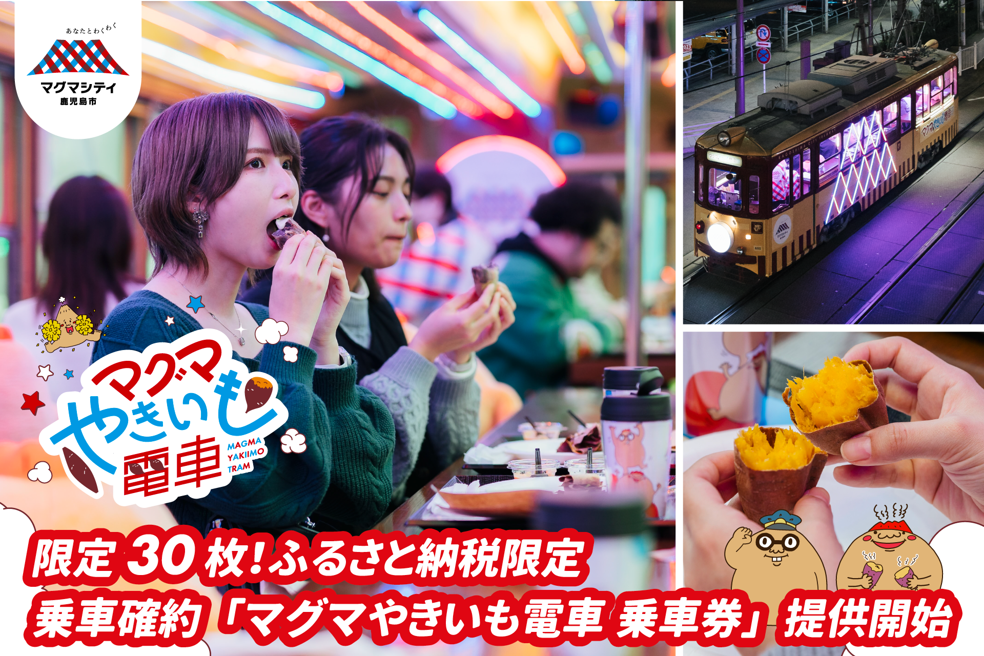120万枚の桜の花びらに埋もれる「SAKURA CHILL BAR by 佐賀」や、⾞内でいちご狩りを楽しむ「いちごさんバス」など、数多くの体験型イベントを⼿がけるクリエイター「アフロマンス」率いるクリエイティブカンパニー「Afro&Co.(東京都渋谷区、代表:山崎 剛弘)」は、⿅児島市(市⻑:下鶴隆央)とコラボレーションし、ほくほくの焼き芋を⾷べながら⿅児島市内を巡る体験型路⾯電⾞「マグマやきいも電⾞」を2026年2月に開催します。体験型路⾯電⾞「マグマやきいも電⾞」の乗車券を、2025年12月18日(木)より、ふるさと納税サイト「ふるさとチョイス」にて返礼品として提供を開始しました。