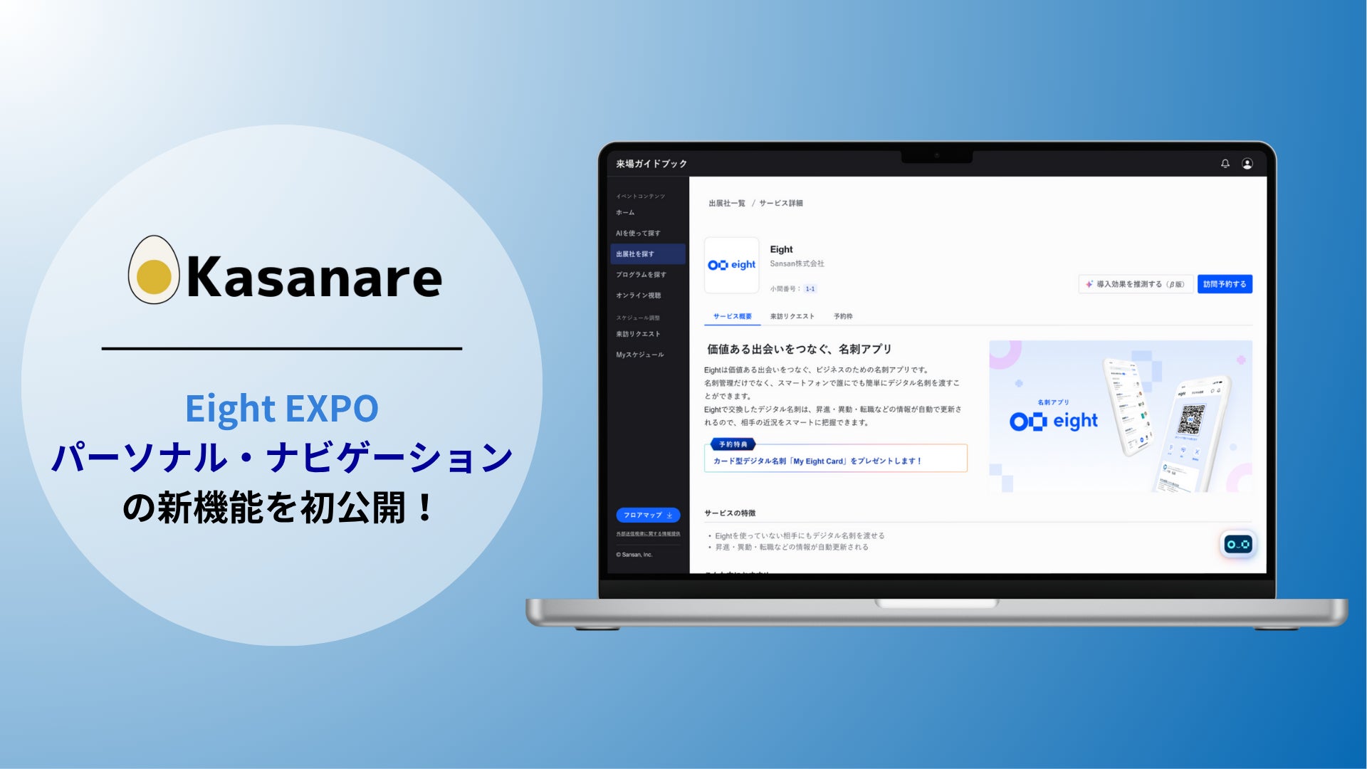 なお、本機能はSansan株式会社(本社:東京都渋谷区、代表取締役社長:寺田 親弘)との共同開発により実現したものです。同社の名刺アプリ「Eight」が主催する展示会「Eight EXPO第4回 営業マーケ DX 比較・導入展」の来場者専用マイページ「来場ガイドブック」にて、本機能が活用されています。