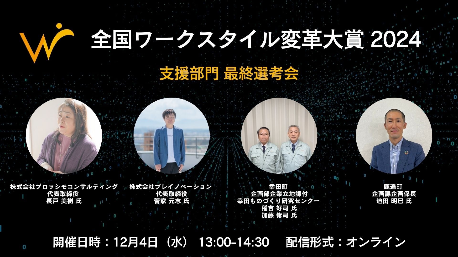 全国ワークスタイル変革大賞実行委員会)は、2024年12月4日(水)に「全国ワークスタイル変革大賞2024 支援部門 最終選考会」をオンラインで開催いたします。