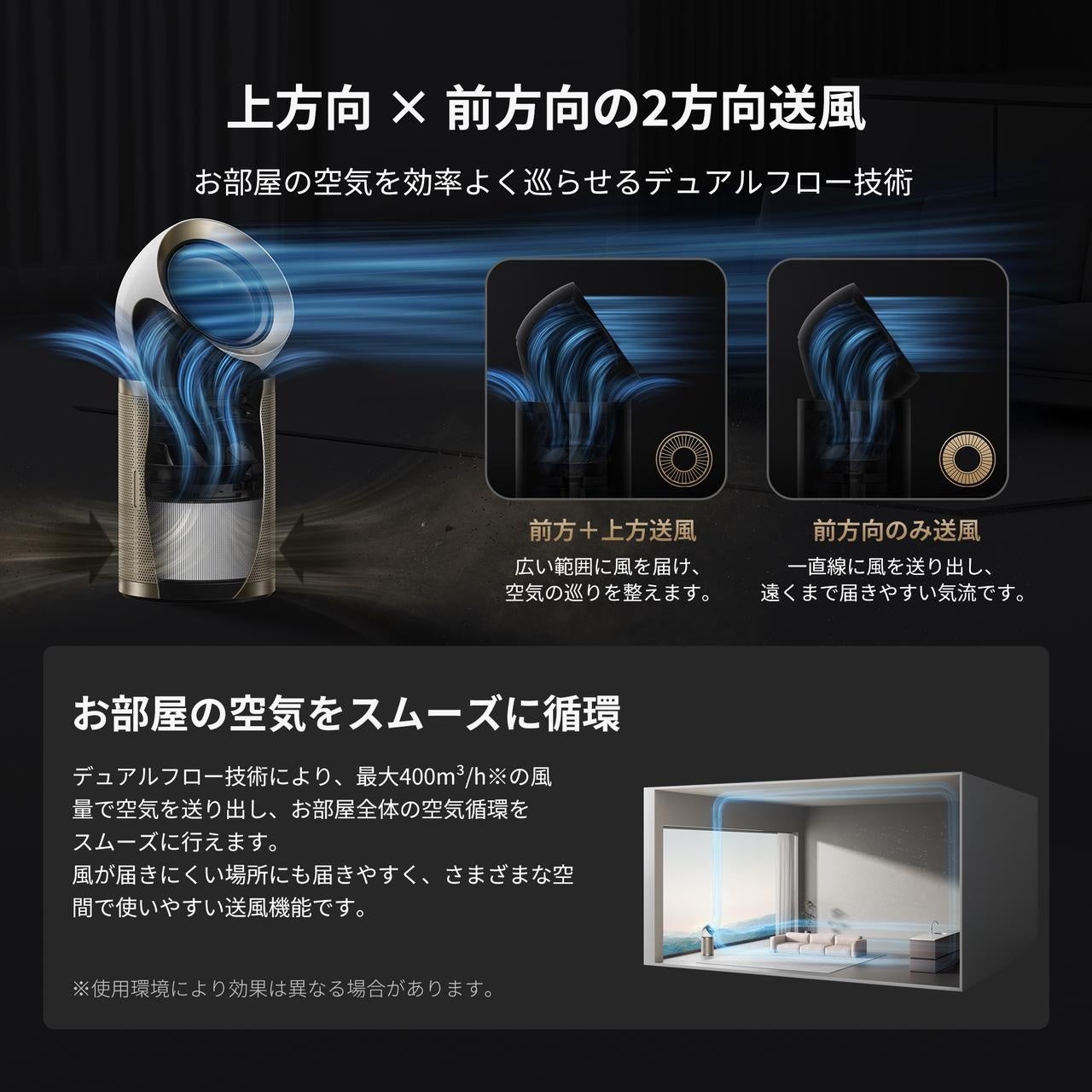 PM20 は、上下方向に分かれた独自のデュアル気流構造を採用しています。上方向の拡散気流は、空気をすばやく均一に循環させ、前方向の直進気流は、使用者がいるアクティブエリアを的確にカバーします。冬の暖房時でも、夏の換気時でも、空気の流れを常にスムーズで快適に保つ設計です。