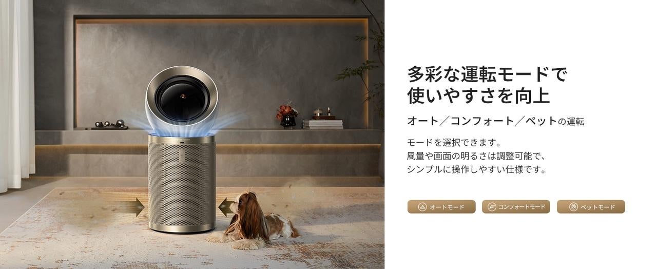 PM20 は、オートモード・コンフォートモード・ペットモード を搭載しています。 オートモードでは、AI が風量と風向きを自動制御。 ペットモードでは、ペットのいる家庭に合わせて調整され、浮遊毛やニオイへの対応力を強化 しています。