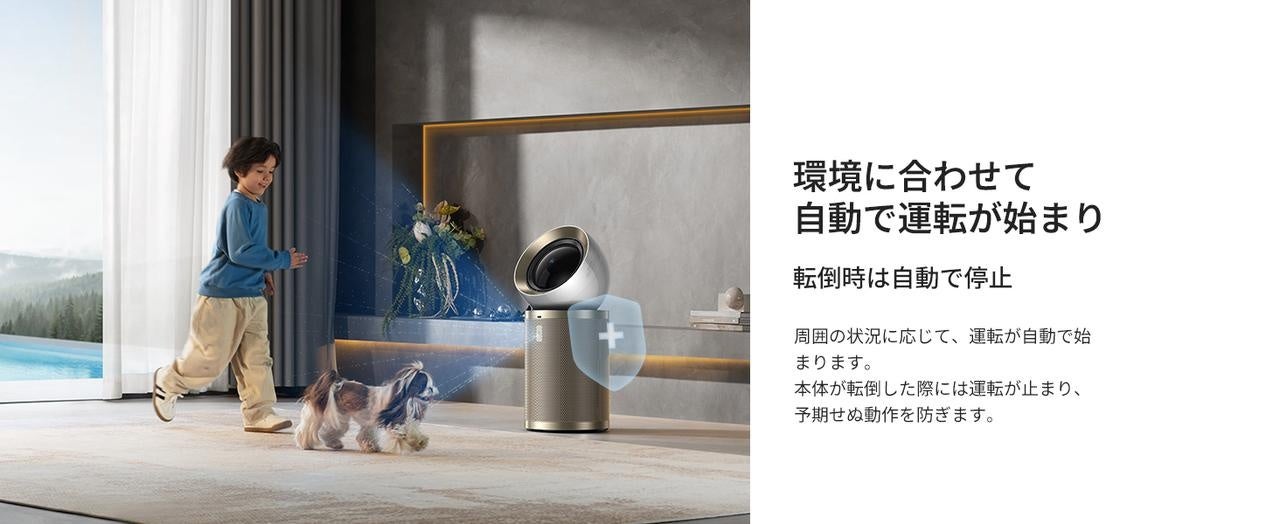 使用者が空間に入ったことを検知すると自動で運転を開始し、離れると省エネ待機モードに移行します。また、本体が転倒した際には自動で電源を遮断し、危険を未然に防ぐ安全設計を備えています。