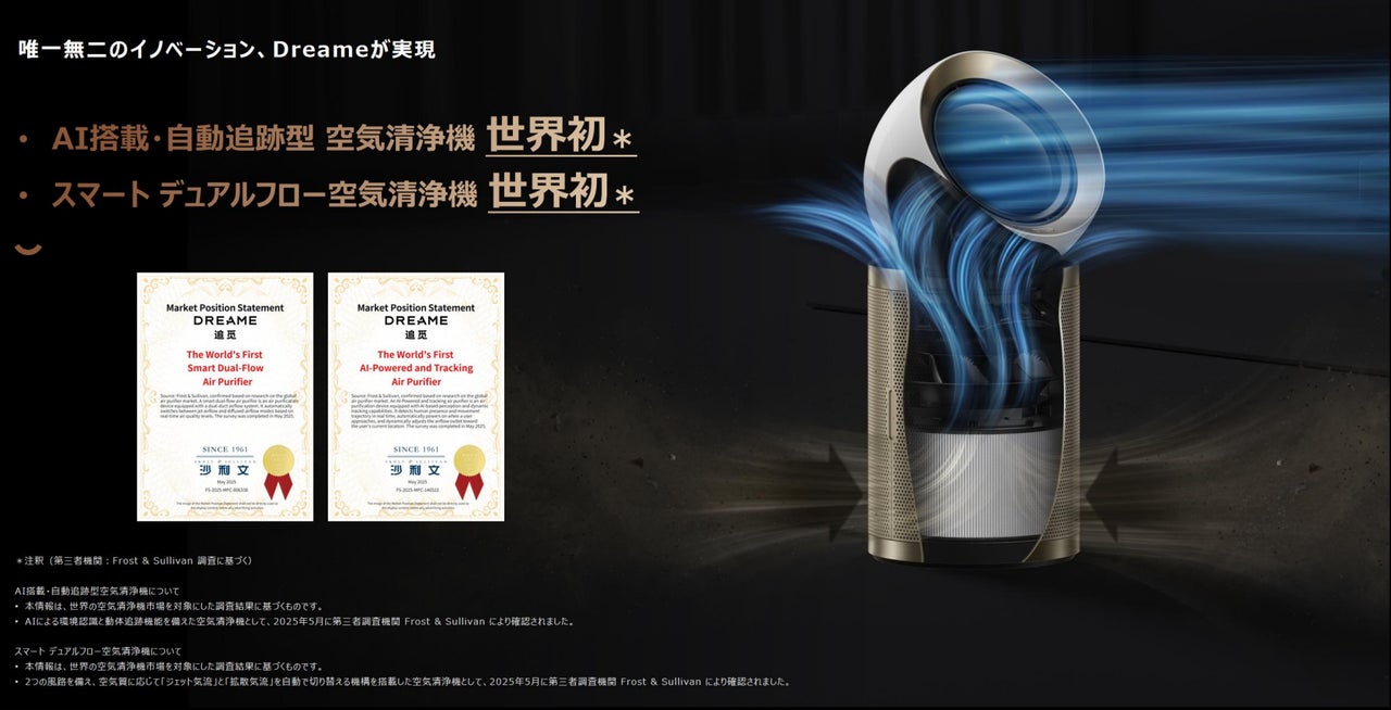 2025年11月、スマート家電ブランドDreame(ドリーミー)は、日本市場に向けて新世代空気清浄機「AirPursue™ PM20」を発表しました。Dreame AirPursue™ PM20 は、国際的な調査会社Frost & Sullivan(フロスト&サリバン)により、2つの「世界初」技術認証を取得しました。同社の Market Position Statement は、世界の市場データと技術比較に基づき、「特定技術が世界で初めて成立したこと」を第三者として公式に確認する評価書です。PM20 は、デュアルフロー構造を採用した空気清浄機として世界初、およびAIが風向を自動追跡・制御する空気清浄機として世界初と認定され、その革新性が国際的に証明されました。