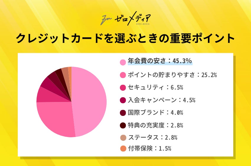クレジットカードを選ぶポイントは「年会費の安さ」が45.3%と最も重要視されている。「ポイントの貯まりやすさ」25.2%。