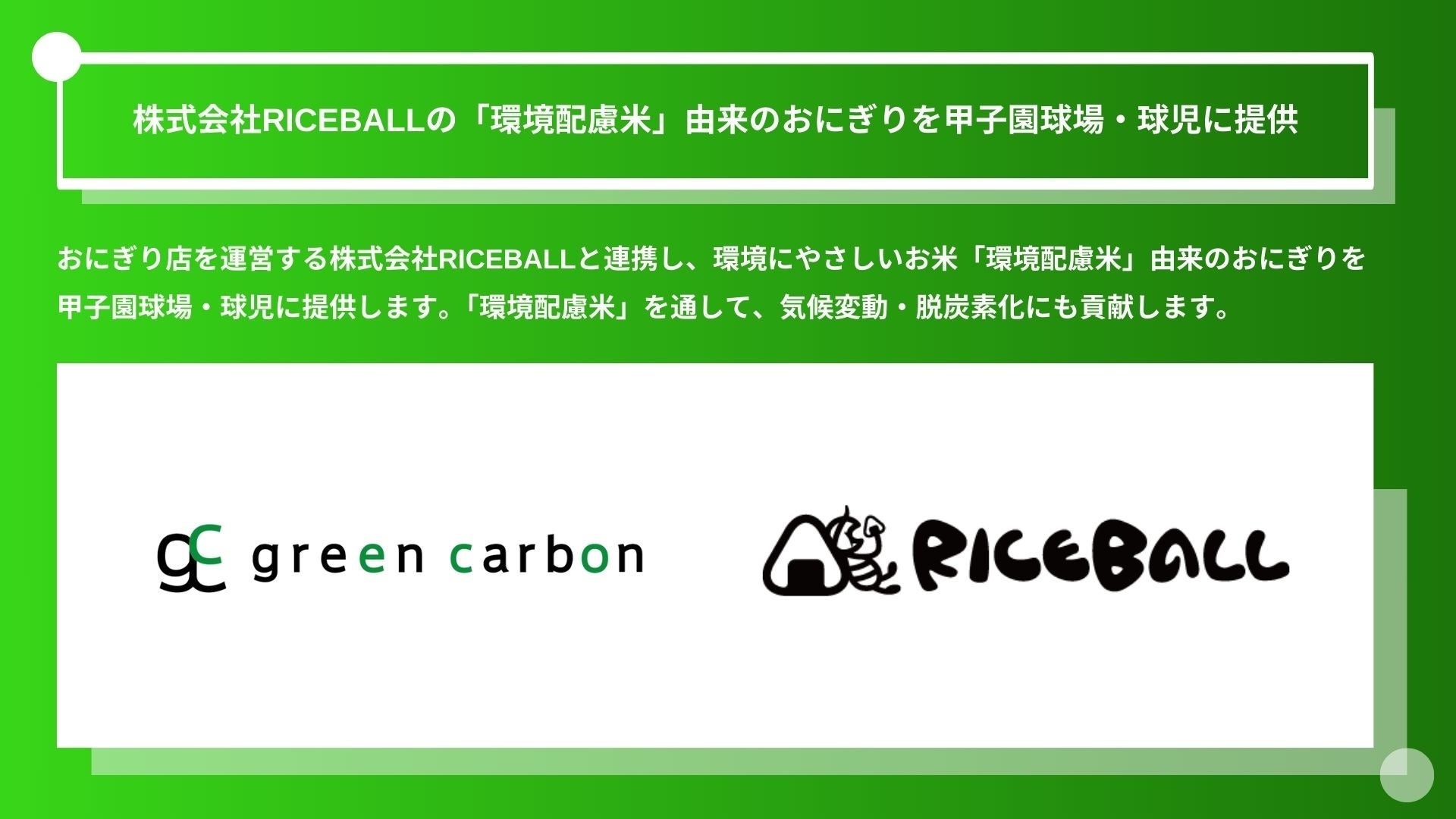 Green Carbon株式会社(代表取締役:大北潤、以下Green Carbon(読み;グリーンカーボン))はこの度、おにぎり店を運営する株式会社RICEBALL(代表:鈴木貴之、以下、RICEBALL)と連携し、環境にやさしいお米「環境配慮米」由来のおにぎりを甲子園球場・球児に提供します。「環境配慮米」を通して、気候変動・脱炭素化にも貢献します。
