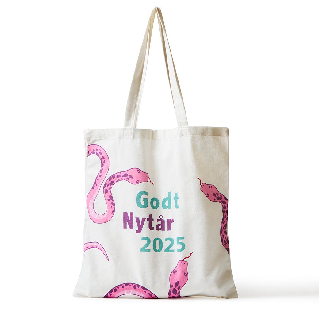 初詣に持っていくのは、もちろん干支のトートバッグ!デンマーク語で「あけましておめでとう」と書かれています。
