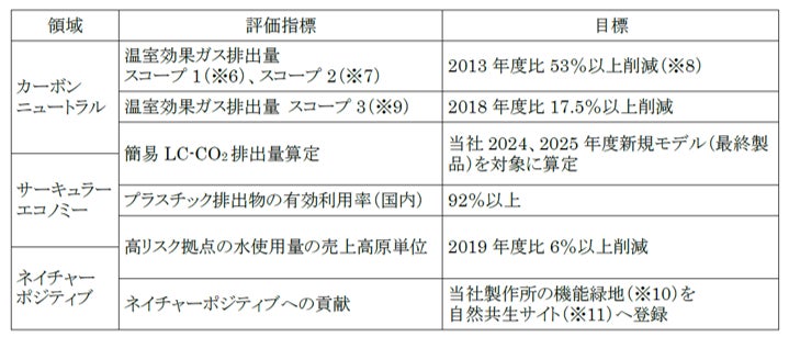 当社グループでは、「環境ビジョン」の実現に向けた施策と目標からなる「環境計画」を数年ごとに策定しており、「環境計画2025」は「環境計画2023(2021年度~2023年度)」に次ぐ新たな計画です。本計画では、「2030年度までに工場・オフィスからの温室効果ガス排出量実質ゼロ」の実現に向けて、2025年度の温室効果ガス排出量削減目標を設定した他、「カーボンニュートラル」「サーキュラーエコノミー」に貢献するLC-CO2 (※4)排出量の簡易算定や、政府が掲げる「30by30(※5)」の実現に寄与する「ネイチャーポジティブ」領域での目標設定等を行いました。