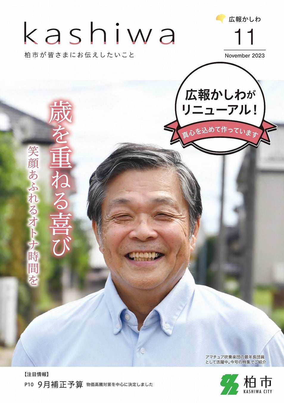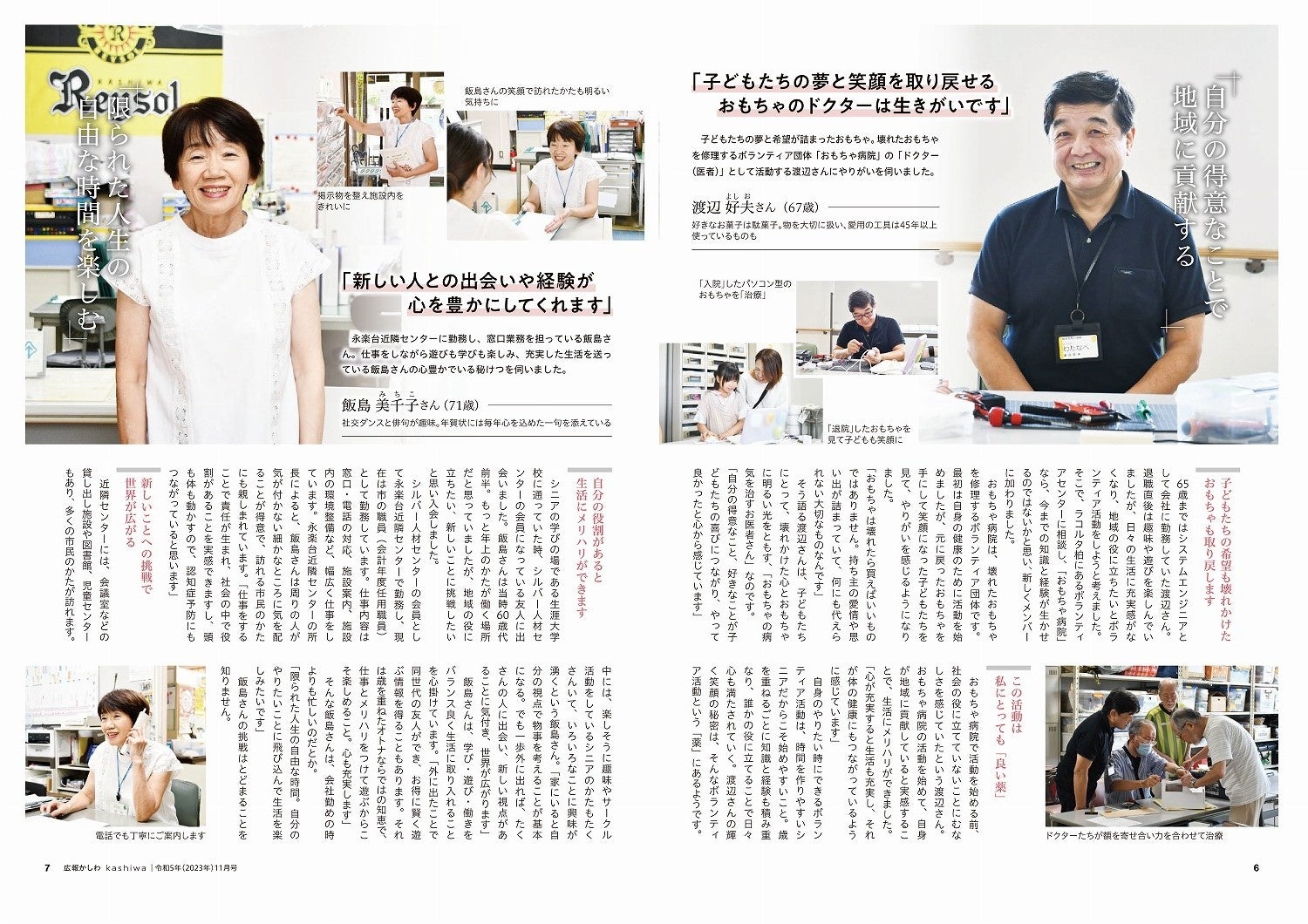 広報かしわは,昨年5月に,配布方法とともに形状を変更するダブルリニューアルを行いました。一つ一つ細かいところまで担当内で作り上げた広報誌が受賞となり大変嬉しいです。特集では,行政が「生きがいを持ちましょう」と勧めるのではなく,市民の言葉や想いなどから,知り合いの体験談を読んでいるような近い距離感を目指し,自分も真似したくなるような内容となるよう心掛けました。