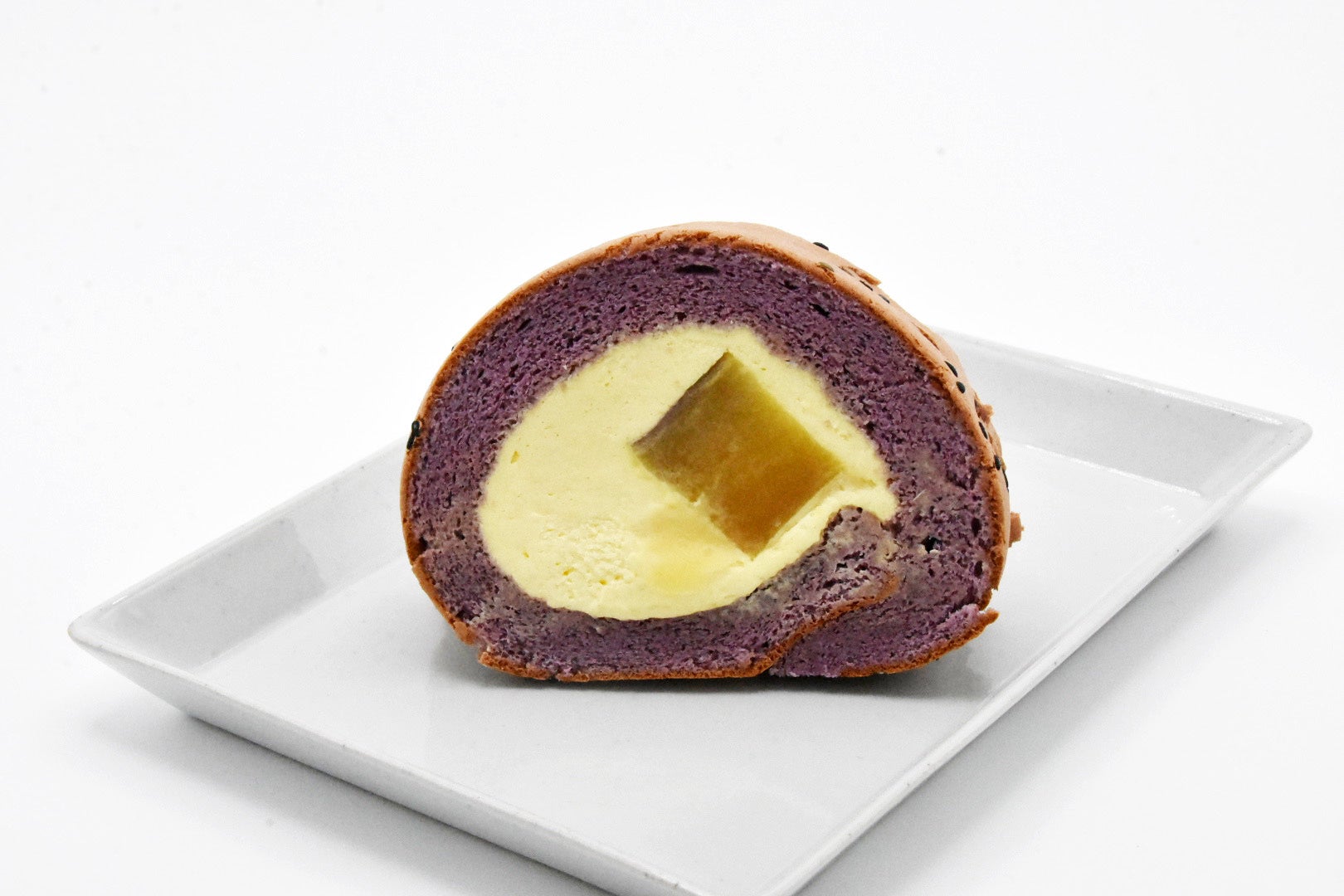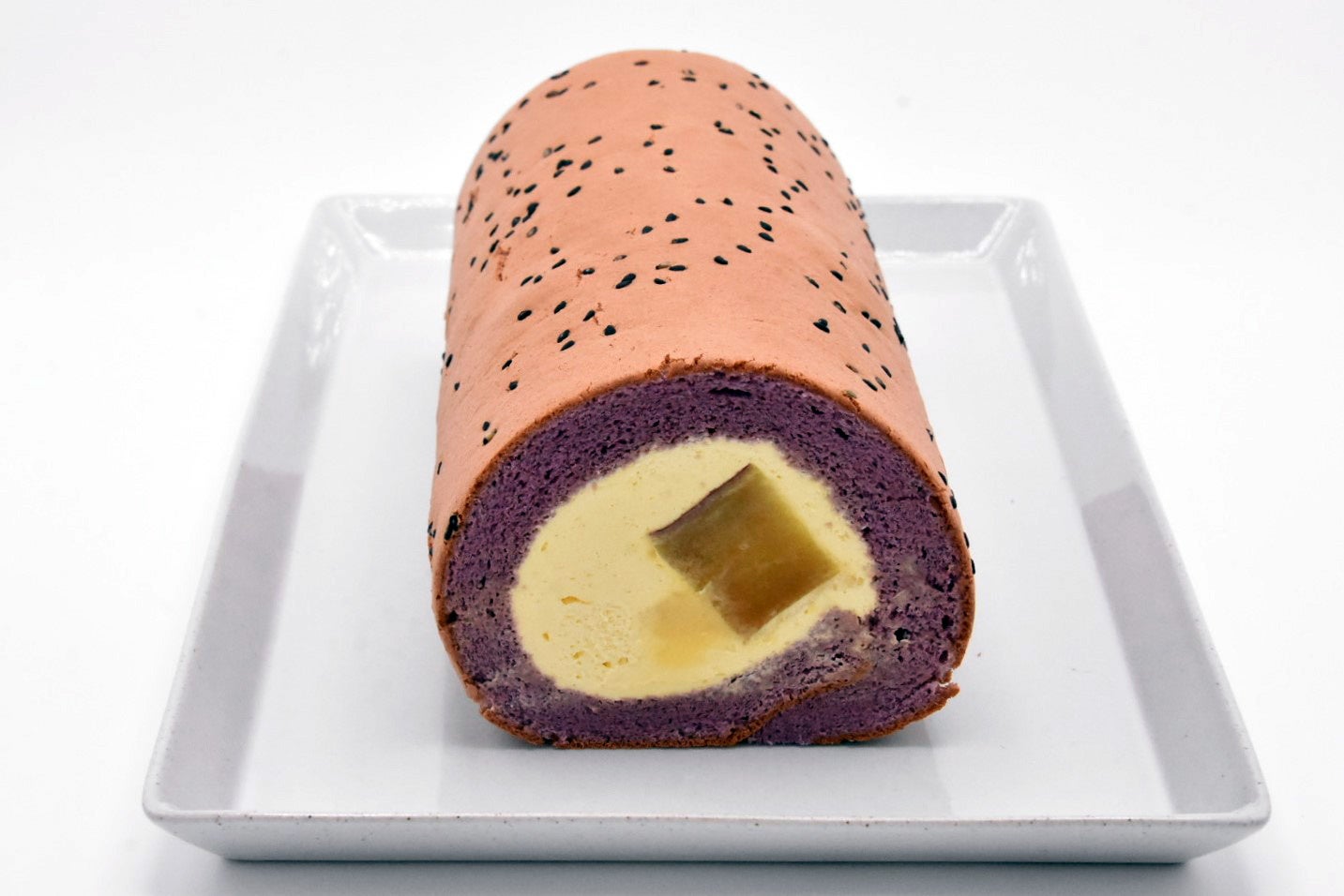 さつまいもの甘露煮やペーストを練り込んださつまいもクリームを、食感や風紀豊かなゴマを練り込んだ紫色の生地で巻き上げ、見た目もまさに「さつまいも」な仕上がりに。