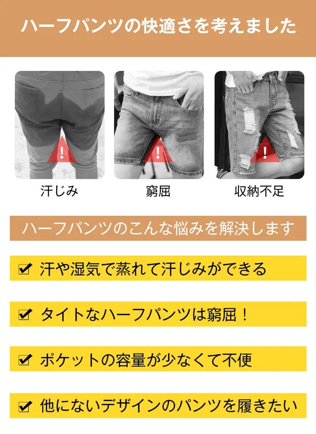 ③ 暑い夏!汗や湿気でハーフパンツに汗じみをつけたくない!の声に応えるクールで大容量なハーフパンツ