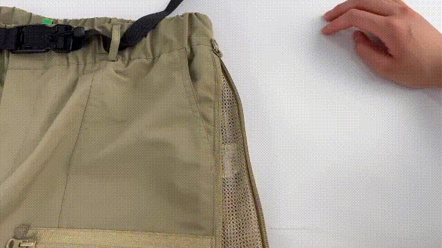 このハーフパンツの最大の特徴は、サイドにジッパーが付いている点です。ジッパーを開くと2層のメッシュ生地が現れ、通気性が大きく向上します。