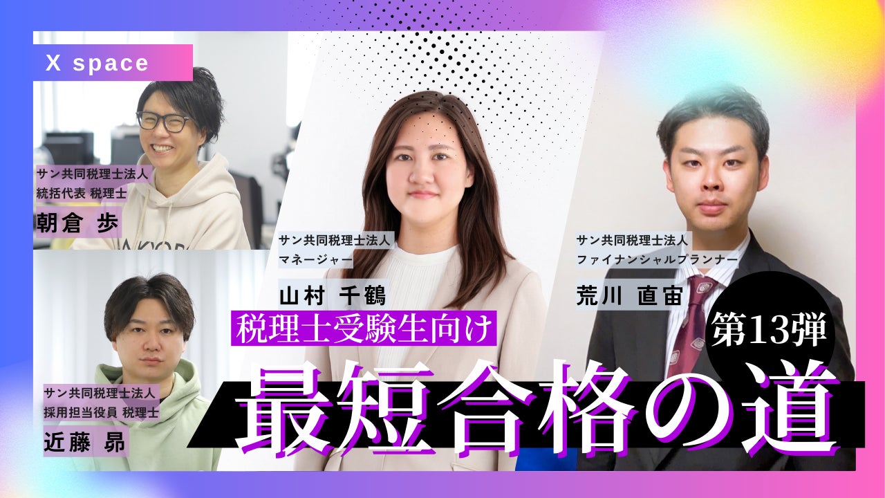 税理士有資格者の過半数は60歳以上と言われる昨今、サン共同税理士法人では税理士業界を盛り上げるべく、受験生にエールを込めて、代表の朝倉と業界で活躍している税理士や税理士受験生をゲストに招き、X(旧Twitter)スペースやインスタライブを定期的に開催。税理士の魅力や最短で合格できる勉強方法、モチベーション維持の仕方などを発信しています。