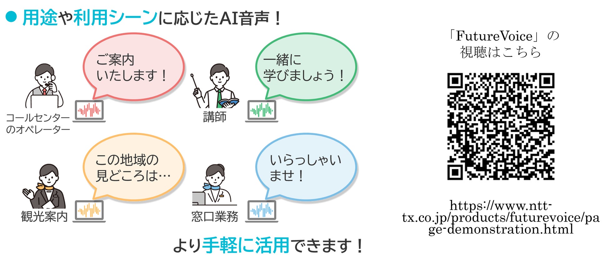 NTT人間情報研究所の最新技術を基に、多彩な声を創り出す音声合成プロダクトです。人の声に近い自然な音声や豊かな感情表現、多言語対応を実現し、コンタクトセンターから動画ナレーションまで、幅広い分野で活用されています。(https://www.ntt-tx.co.jp/products/futurevoice/)