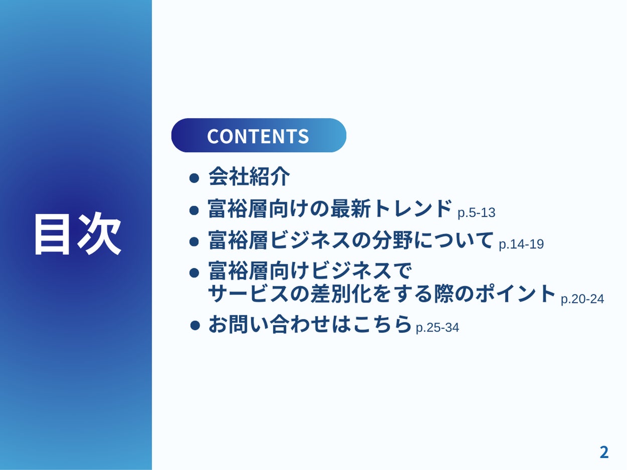 本レポートでは、富裕層のサービスの差別化をしたい方向けにマーケティングのアプローチ方法をご紹介しています。富裕層の集客にお困りの方にはおすすめの内容です。