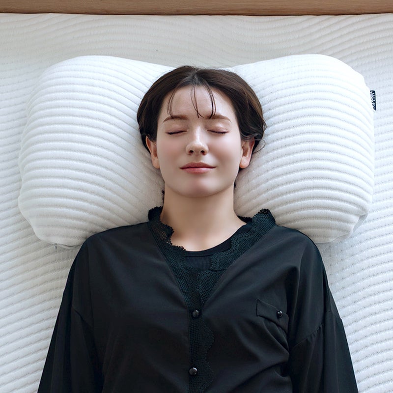 首と肩のラインに沿う、人間工学に基づいた独自カーブが首元に心地よくフィット。サイドを高めにした立体構造により、仰向け・横向きどちらの姿勢でも頭部をしなやかに安定させます。