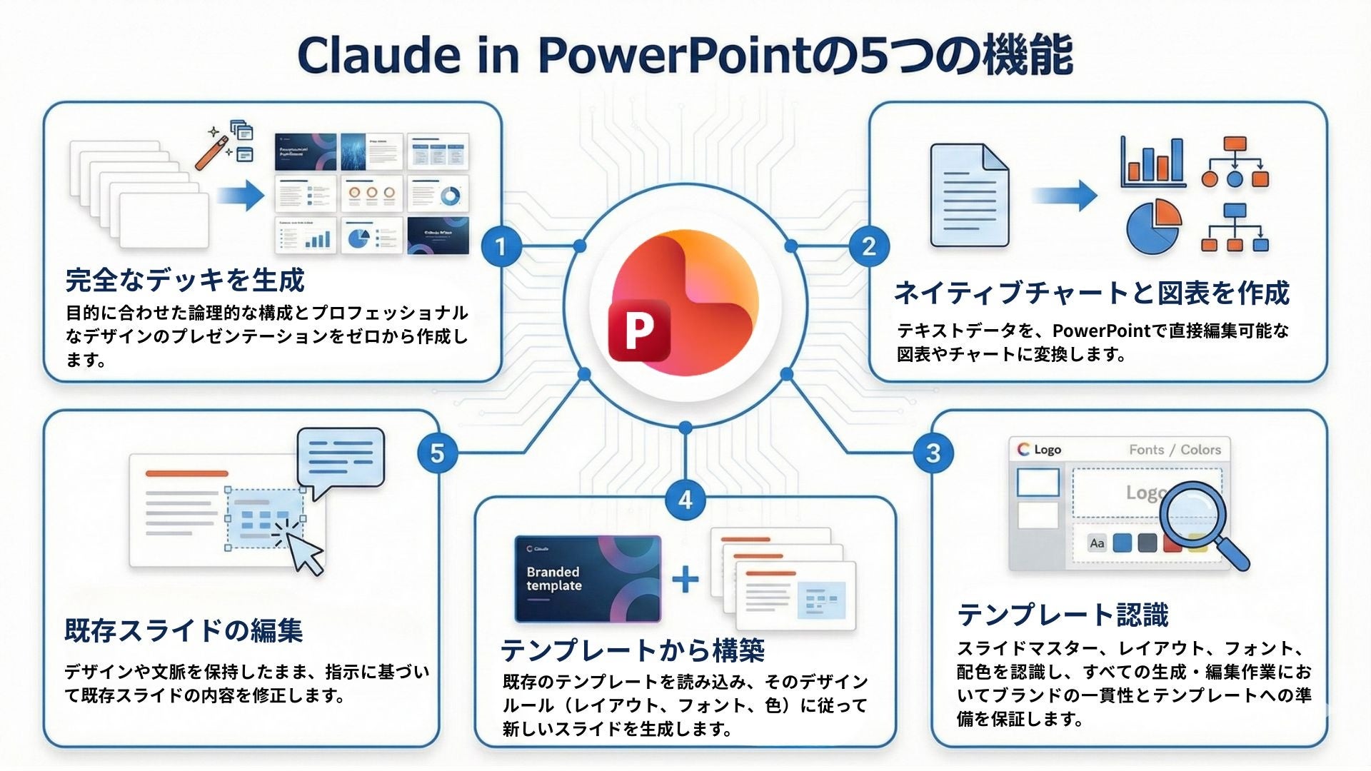 テンプレート準拠の生成については、現時点で安定性や再現性に課題が残る一方、単純な差し替えや部分編集の体験は着実に改善が進んでいます。昨年からの進化幅を踏まえると、資料作成の実務フローにAIが本格的に組み込まれるフェーズに入りつつあると言えます。本号では、5つの主要機能の要点を整理し、テンプレート運用時の注意点を解説しています。