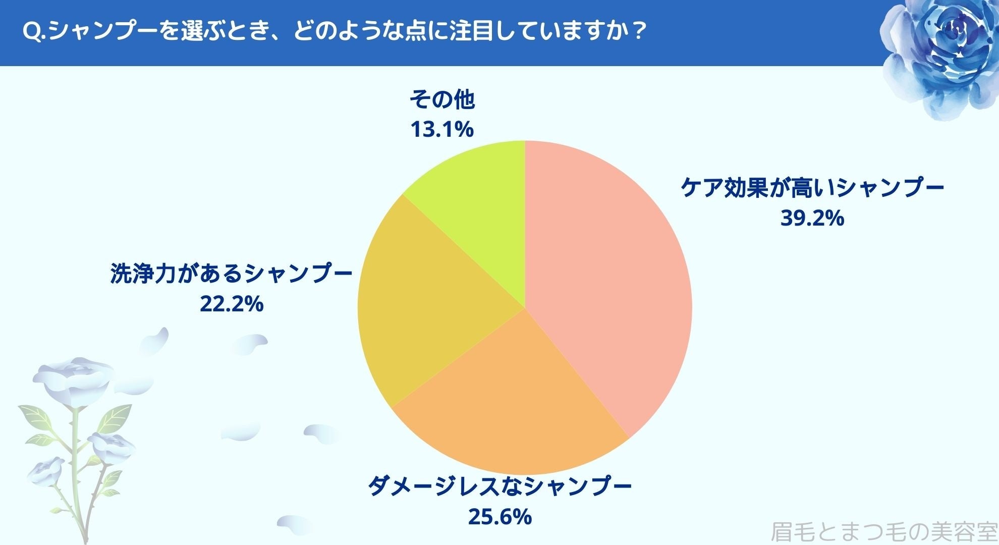 シャンプー選びで何を重視しているのかお聞きしたところ「ケア効果が高いシャンプー(39.2%)」、「ダメージレスなシャンプー(25.6%)」、「洗浄力があるシャンプー(22.2%)」、「その他(13.1%)」という結果になりました。