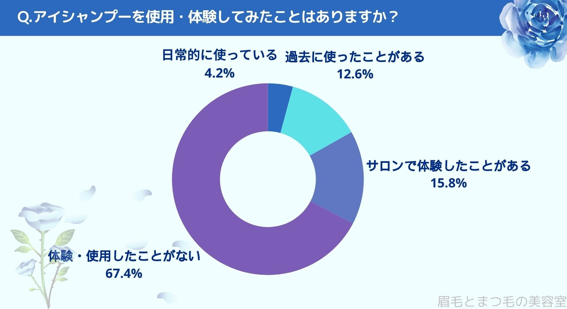 アイシャンプーを使用・体験したことがあるかお聞きしたところ「日常的に使っている(4.2%)」、「過去に使ったことがある(12.6%)」、「サロンで体験したことがある(15.8%)」、「体験・使用したことがない(67.4%)」という結果になりました。