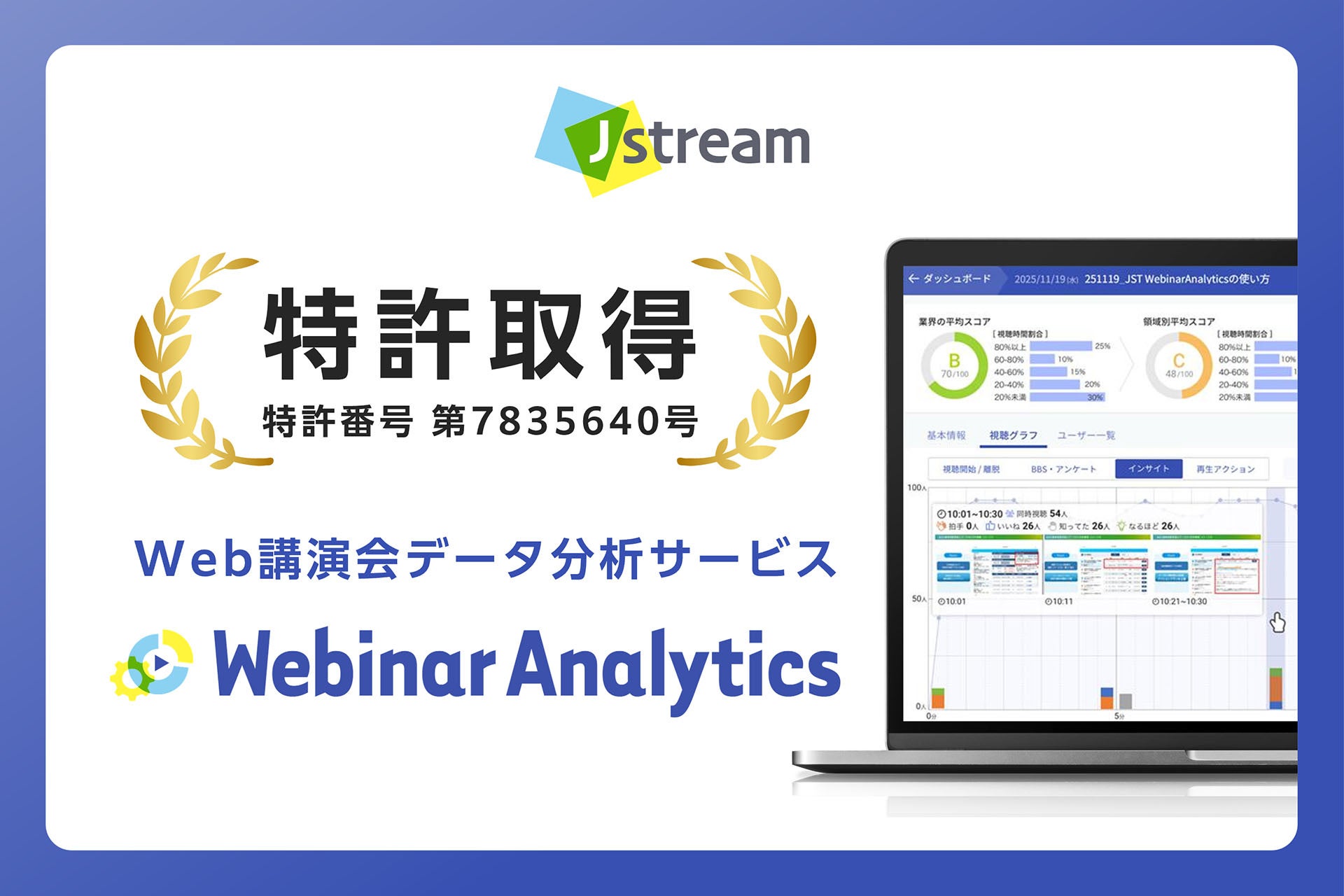 株式会社Jストリーム(東証グロース:4308 代表取締役社長:石松 俊雄、以下Jストリーム)は、Web講演会データ分析サービス「WebinarAnalytics」に関するコア技術について、日本国内で特許を取得したことをお知らせいたします。本特許は、Web講演会を視聴した医師の「興味が高まった瞬間」や「離脱ポイント」を、視聴ログとリアクションを統合し、医師の反応を数値化する解析技術に関するものです。この技術を搭載するWebinarAnalyticsは反応の可視化にとどまらず、講演の理解度や関心度を定量的な指標で数値化します。