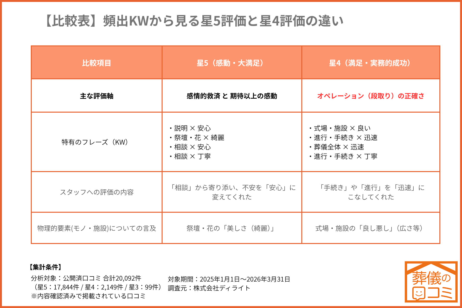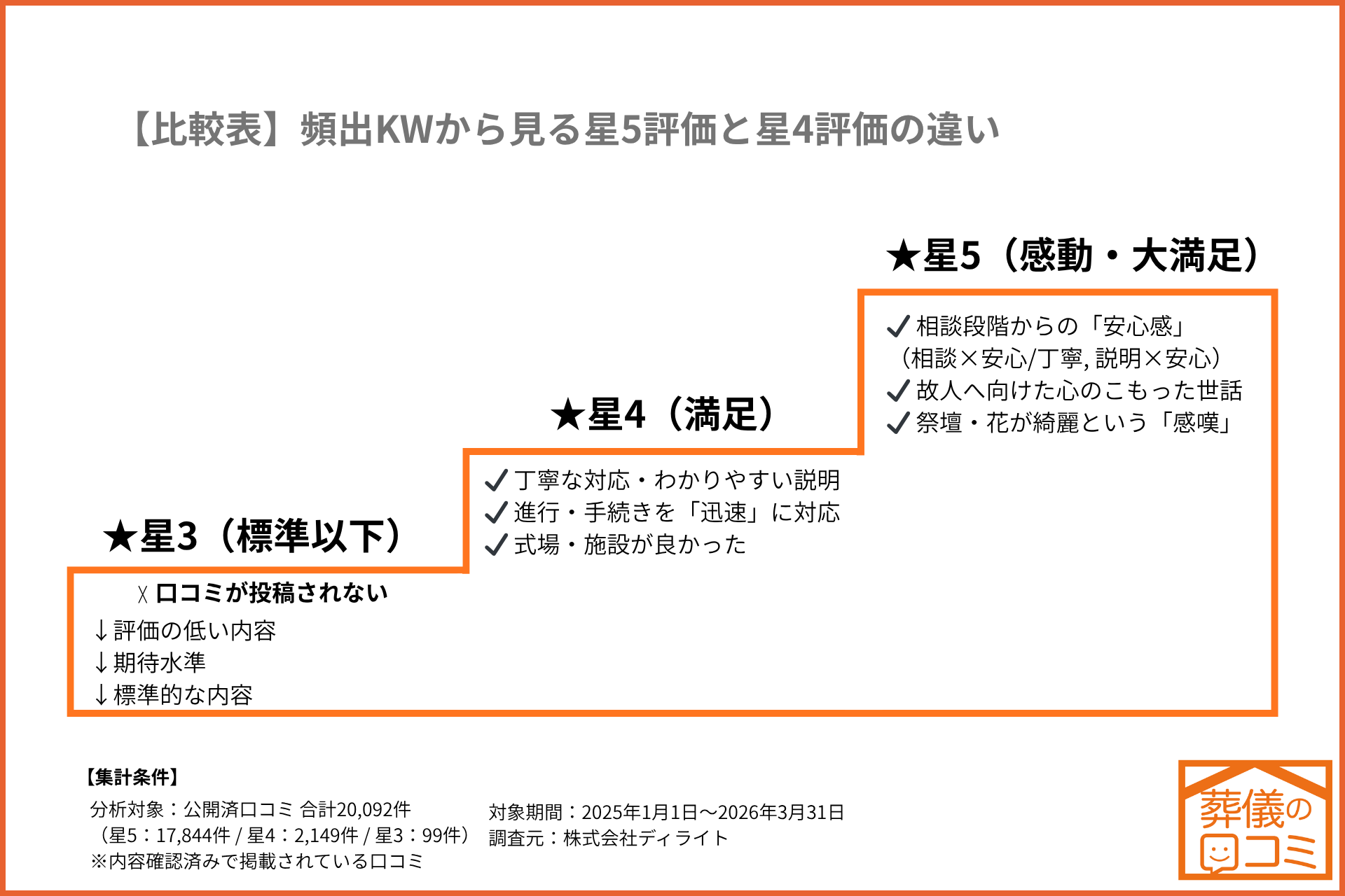 星4の口コミでは「式場・施設 × 良い(4.09%)」「進行・手続き × 迅速(3.91%)」「葬儀全体 × 迅速(3.82%)」「進行・手続き × 丁寧(3.54%)」のように、サービス品質は評価されているものの、消費者にとって想定の範囲内であることから星4に留まっていました。