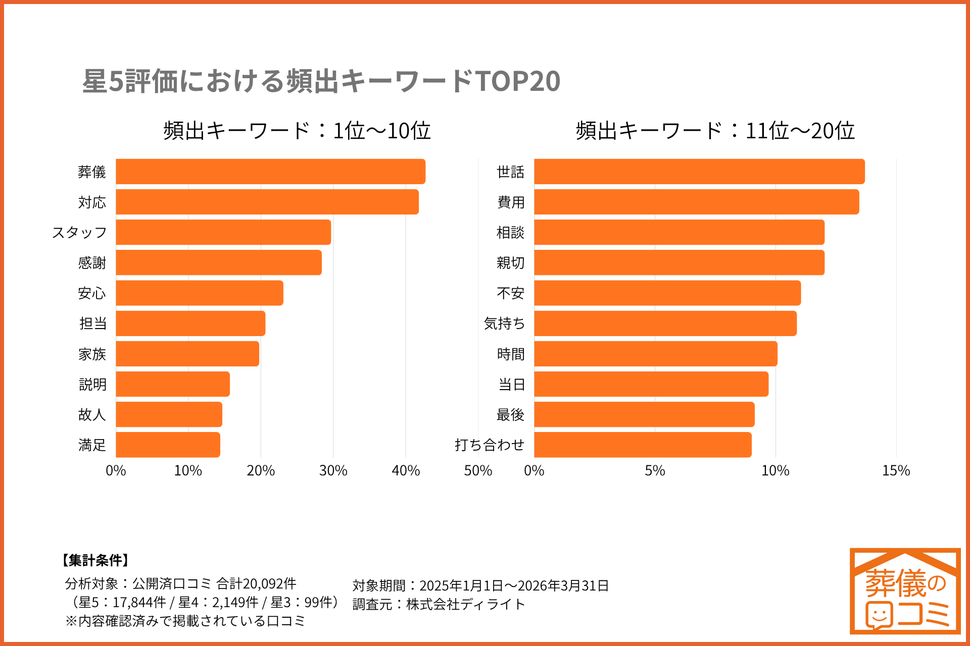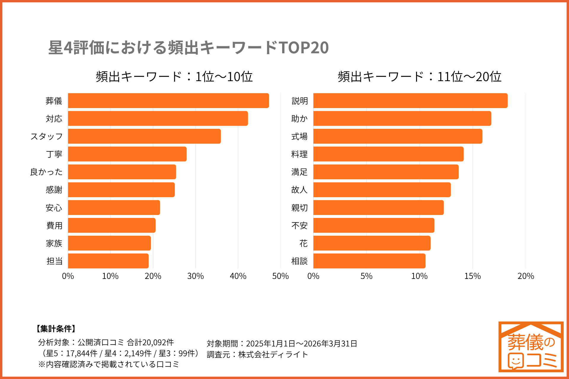 株式会社ディライト(本社:東京都新宿区、代表取締役:高橋 亮)は、運営する葬儀専門口コミサイト「葬儀の口コミ」に掲載された口コミ20,092件(対象期間:2025年1月1日〜2026年3月31日)を分析したレポートを4月23日に公開しました。