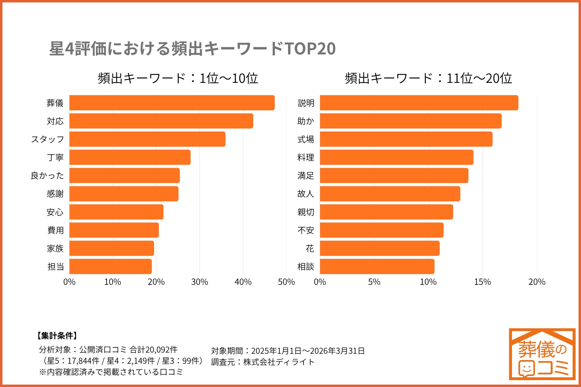 一方、星4の口コミでは「丁寧(27.92%)」「助か(りました)(16.75%)」「式場(15.91%)」など、サービス品質への感謝を示すキーワードが頻出しています。