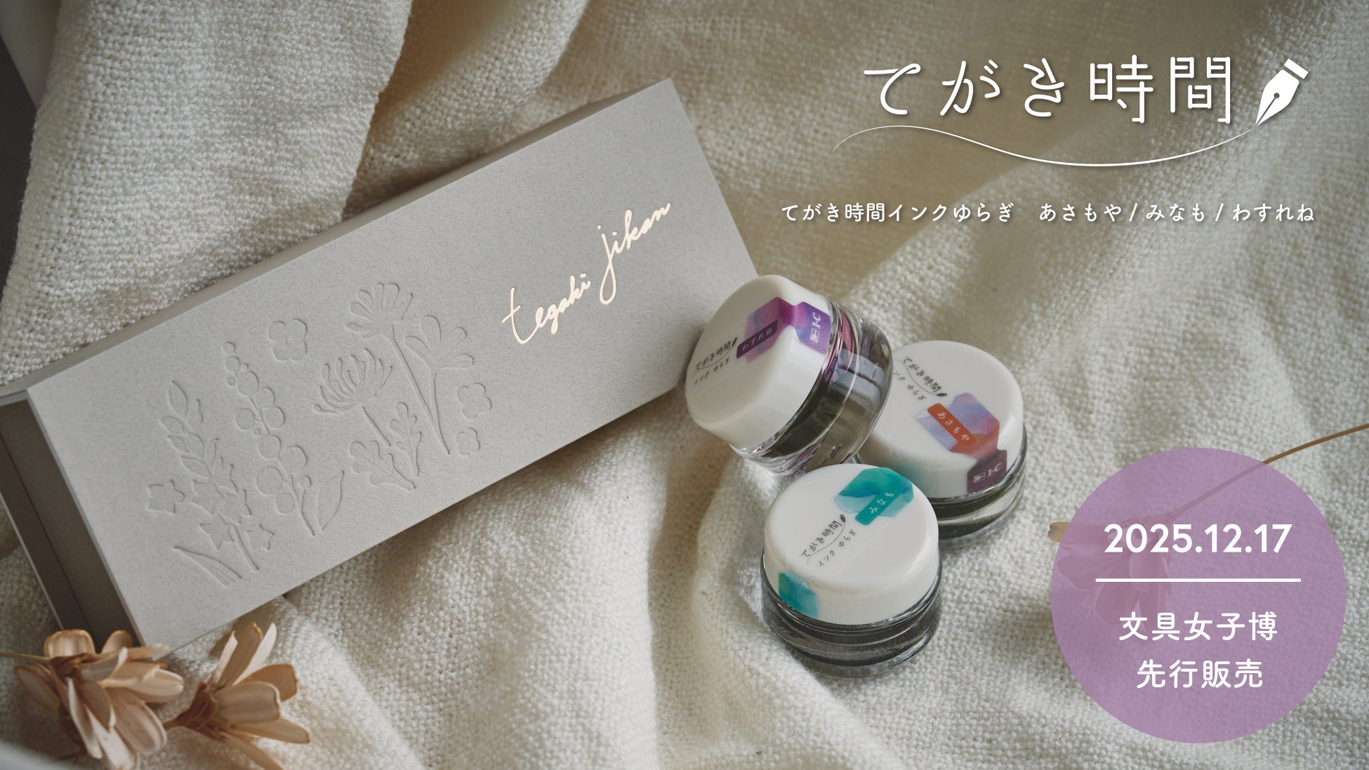文具女子博2025の会場では、オリジナル箔押しパッケージにインク現品をセットした『アイシー てがき時間インク ゆらぎ 3個セット』も同時販売いたします。