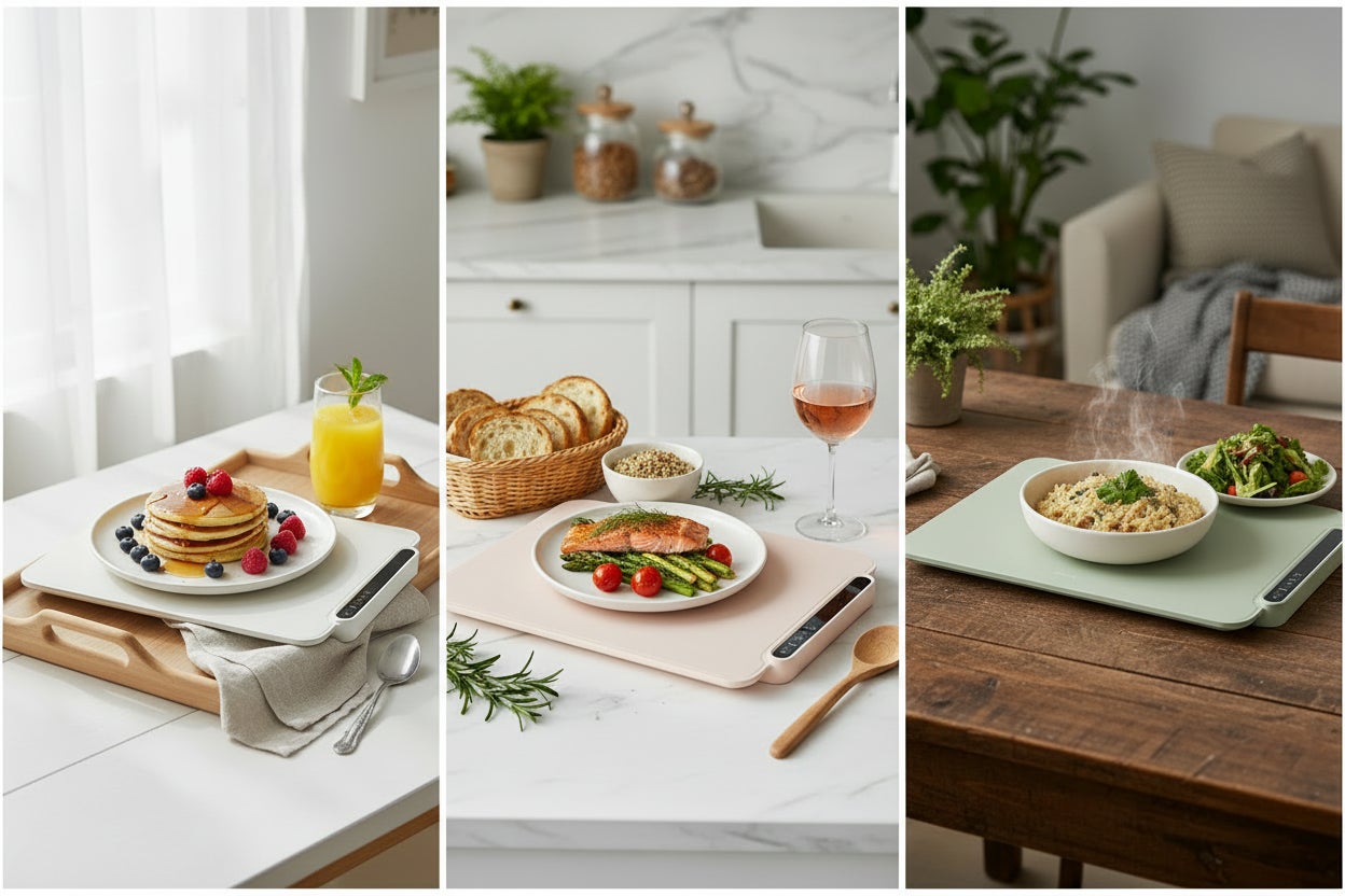 本製品は、60/80/100℃の3段階温度調節と、電源・温度調節に絞ったタッチパネル式のシンプル操作を採用。鍋や大皿料理、朝食、ティータイムなどの食卓シーンはもちろん、冷凍食品の解凍や生地の発酵(60℃)にも活躍します。さらに、ウォーマー部分は柔らかなシリコン製で、使わない時は巻いてコンパクトに収納でき、お手入れもしやすい仕様です。