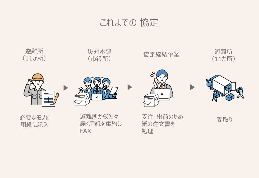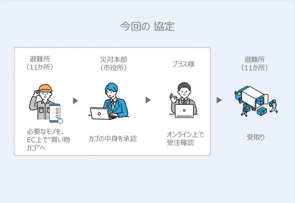 ECサイトを活用し、必要物資の集約・発注から避難所への納品までの作業工程を短縮します。