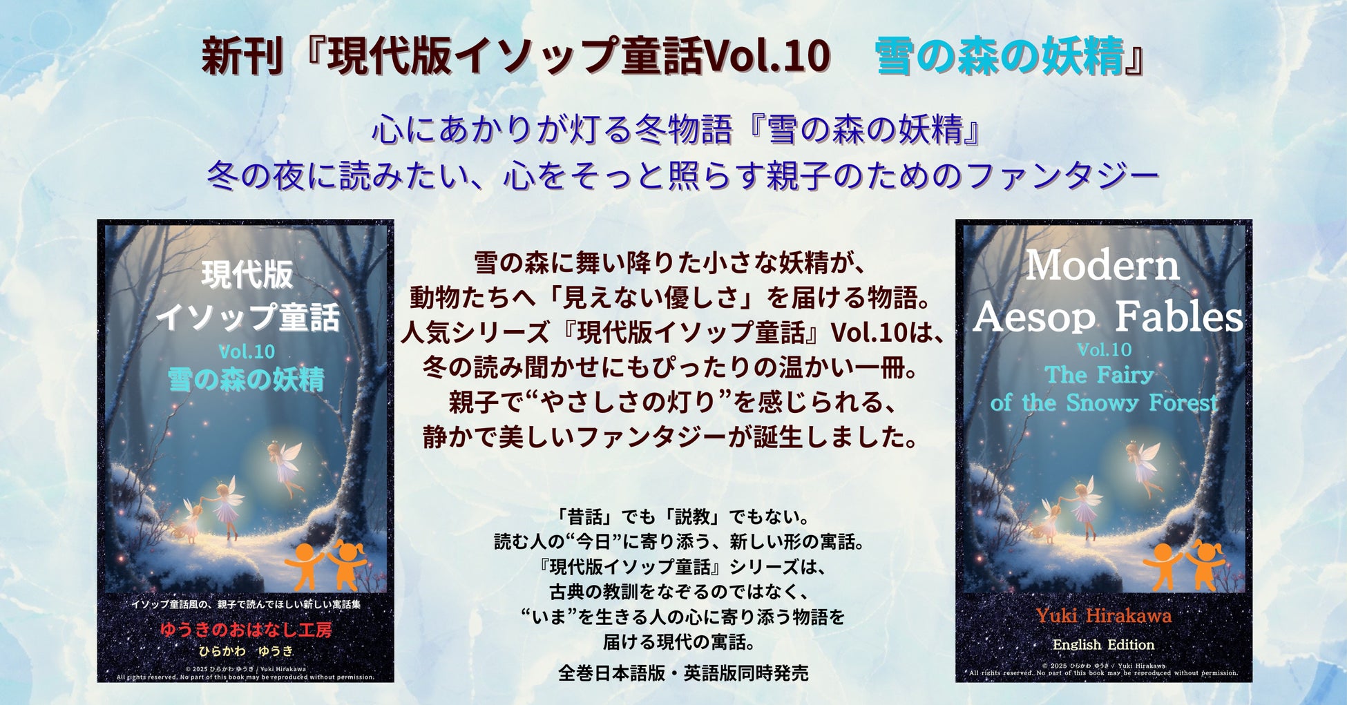 ひらかわゆうきの人気シリーズ『現代版イソップ童話』に、冬の新作 Vol.10『雪の森の妖精』が登場しました。親子で“やさしさの灯り”を感じられる、静かで美しいファンタジーです。