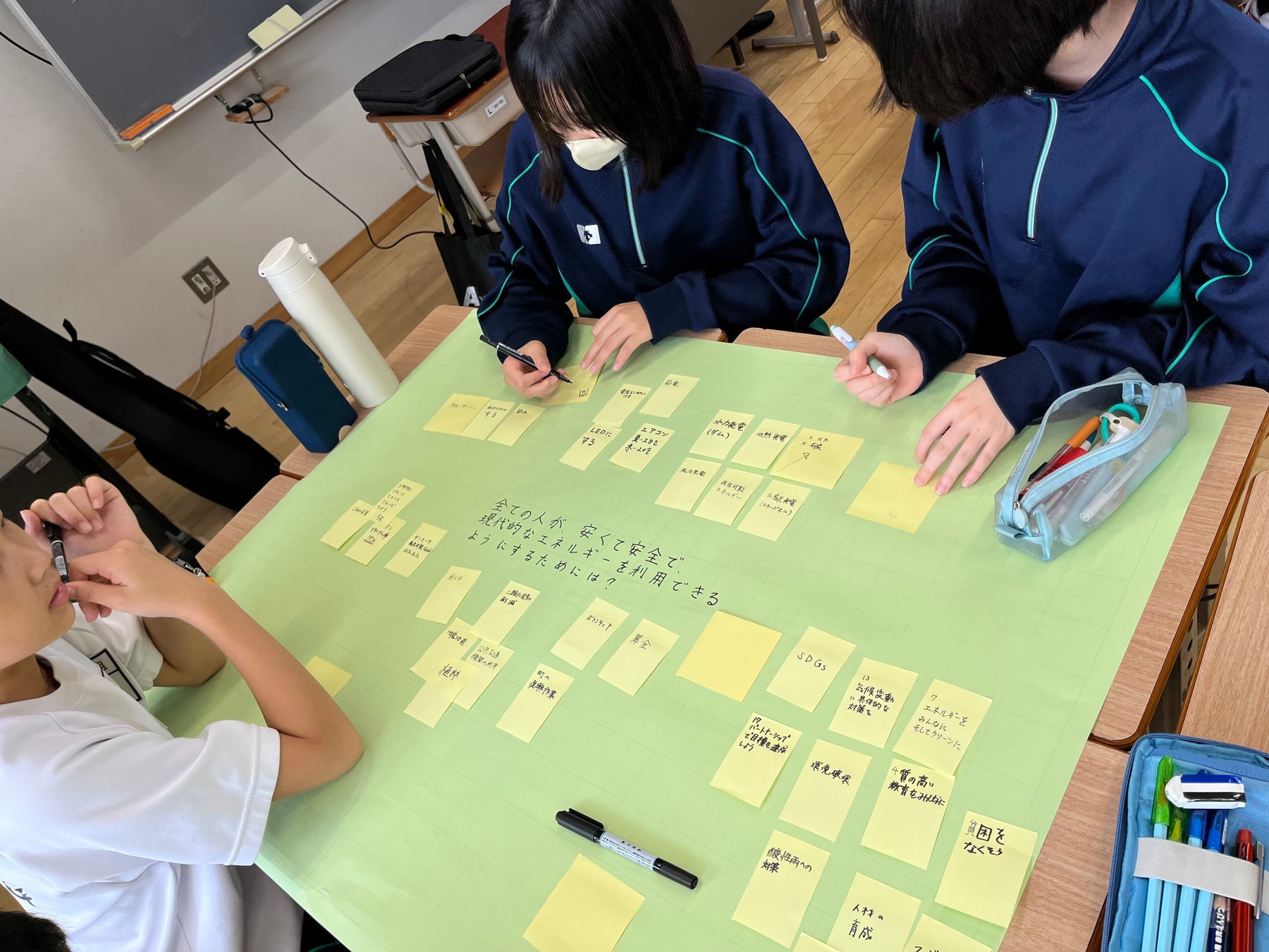 その後、なかよし学園は1年生各クラスの授業にも監修として参加し、「今、自分に何ができるか」を考える探究学習を支援。生徒たちは、世界の課題に対して中学生の自分たちにもできるアクションがあることを学びながら、具体的な表現や発信の方法を模索していきました。
