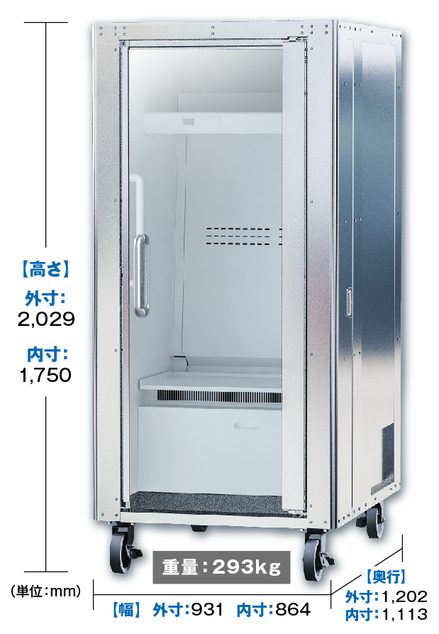 単相100V電源対応で工事不要、キャスター付きのため移動も簡単です。また、IPX3相当の防水仕様で屋外使用にも対応しているため、工場内や建設現場、屋外イベント会場など様々な環境で使用可能です。