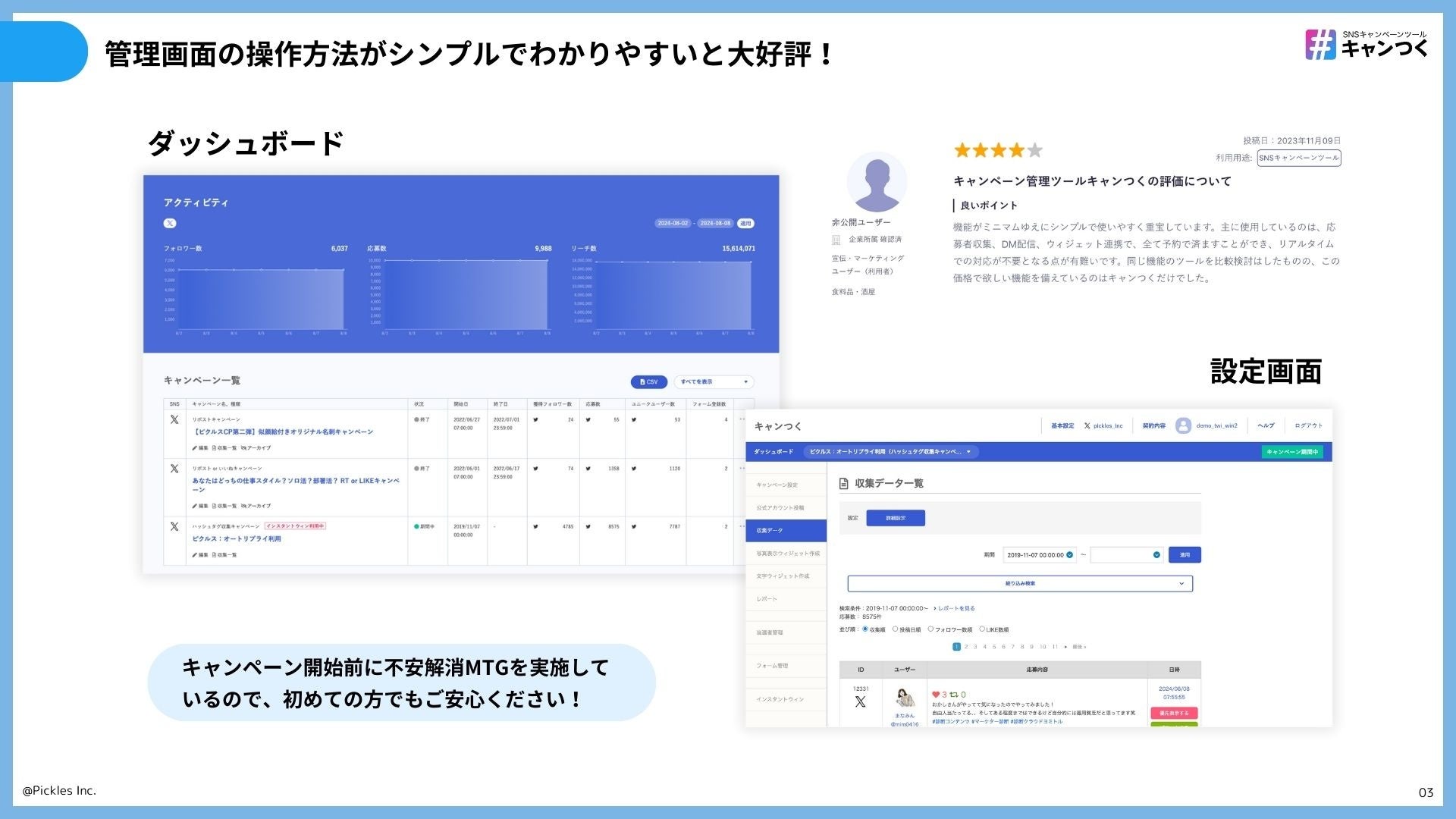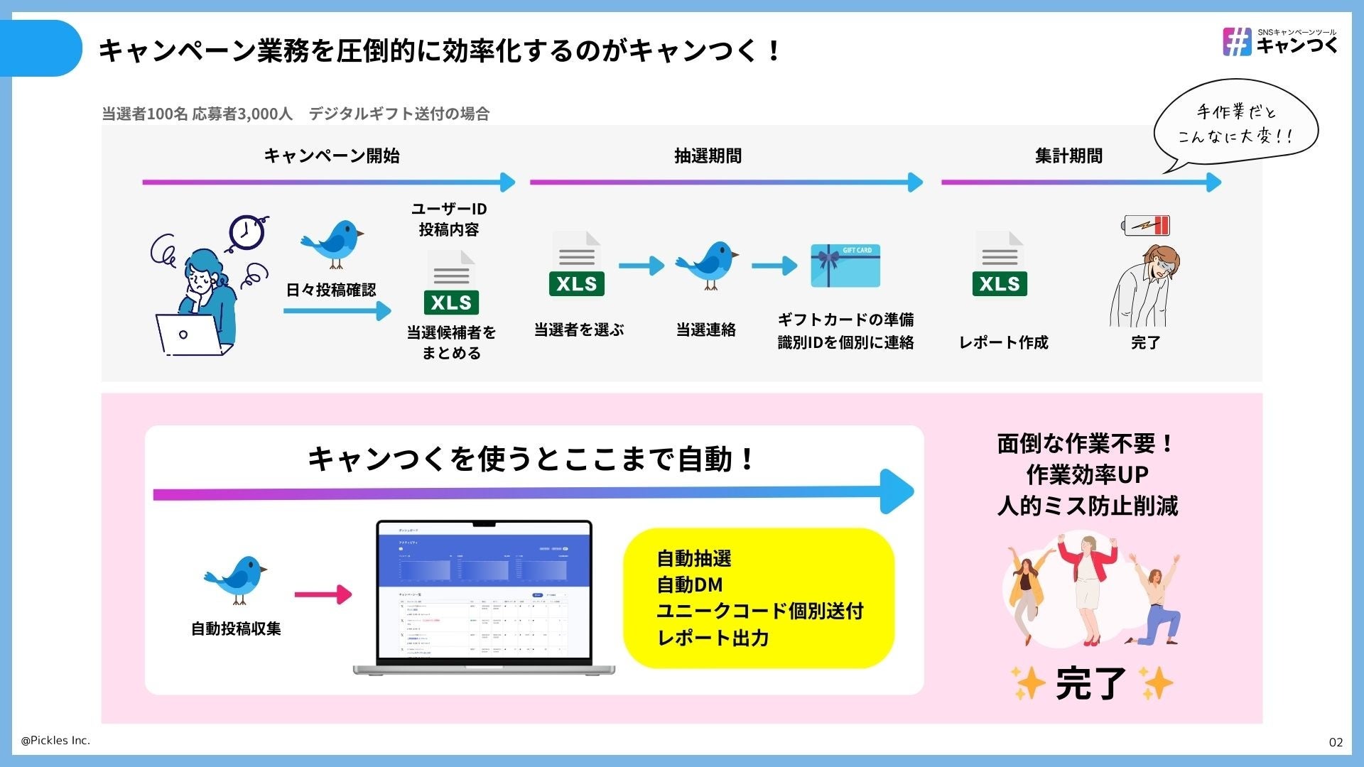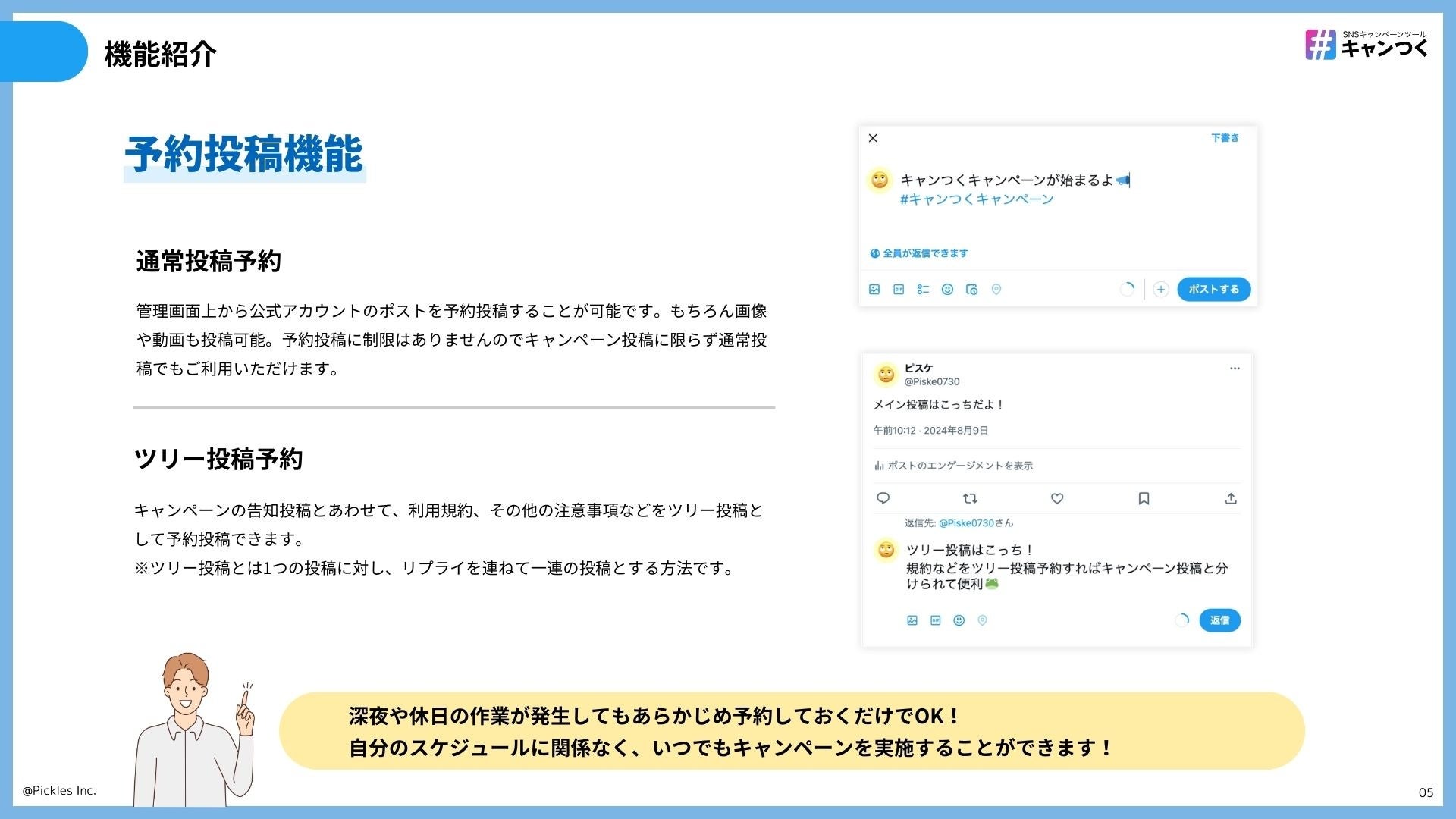 株式会社ピクルス(本社:東京都品川区、代表取締役社長:田中 稔、以下「ピクルス」)は、「導入メリットが5分でわかる!キャンつく機能ガイド」を無料で公開いたしました。本資料は、機能の便利ポイントをコメント付きで詳しく解説しています。