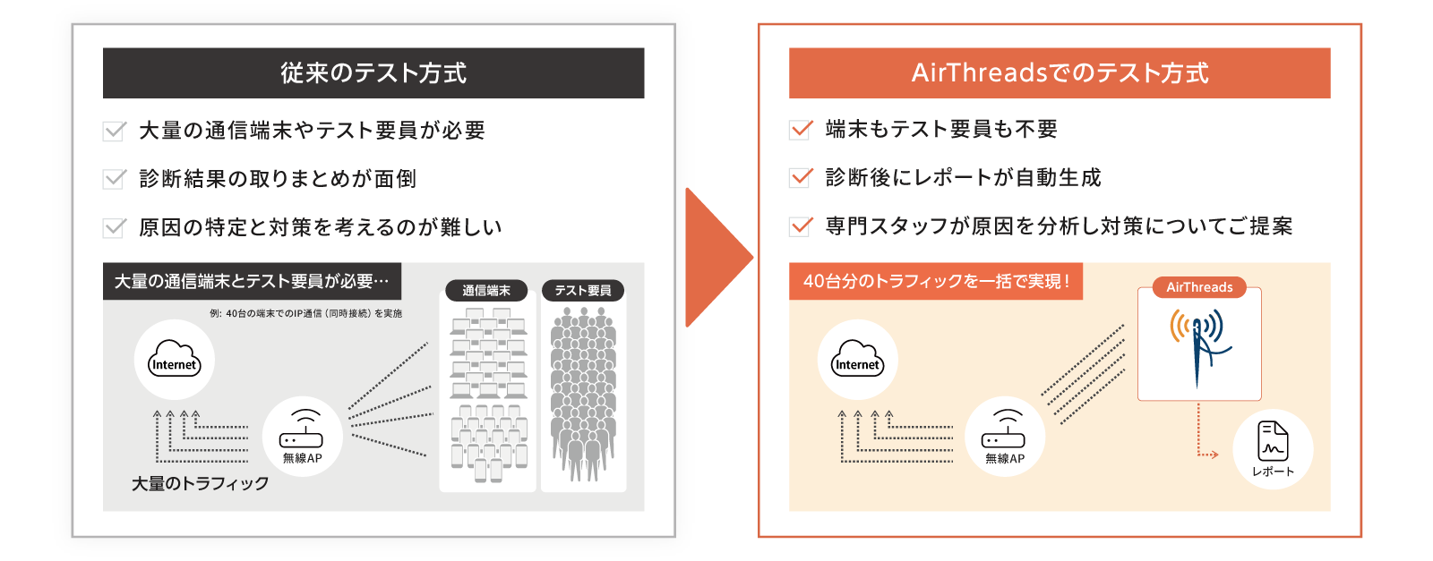 テスト後の診断やトラブルシューティングが現場で必要となることや、原因の特定や対策検討が難しいといった課題に対し、テストから原因の特定、対策の提案までAirThreads側で対応します。