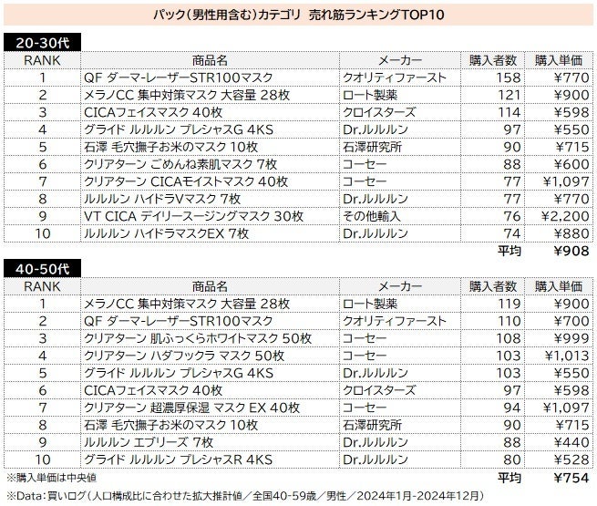 各年代の上位に「男性用パック」はランクインしておらず、性別にこだわりなく商品を購入しているようです。